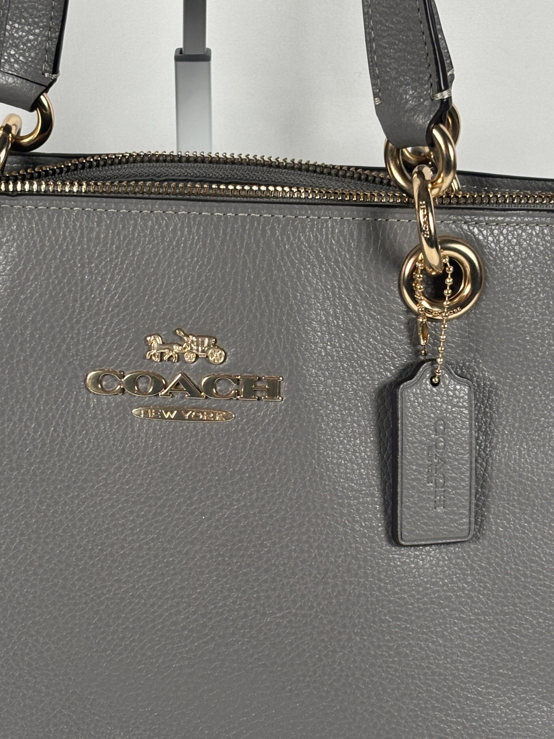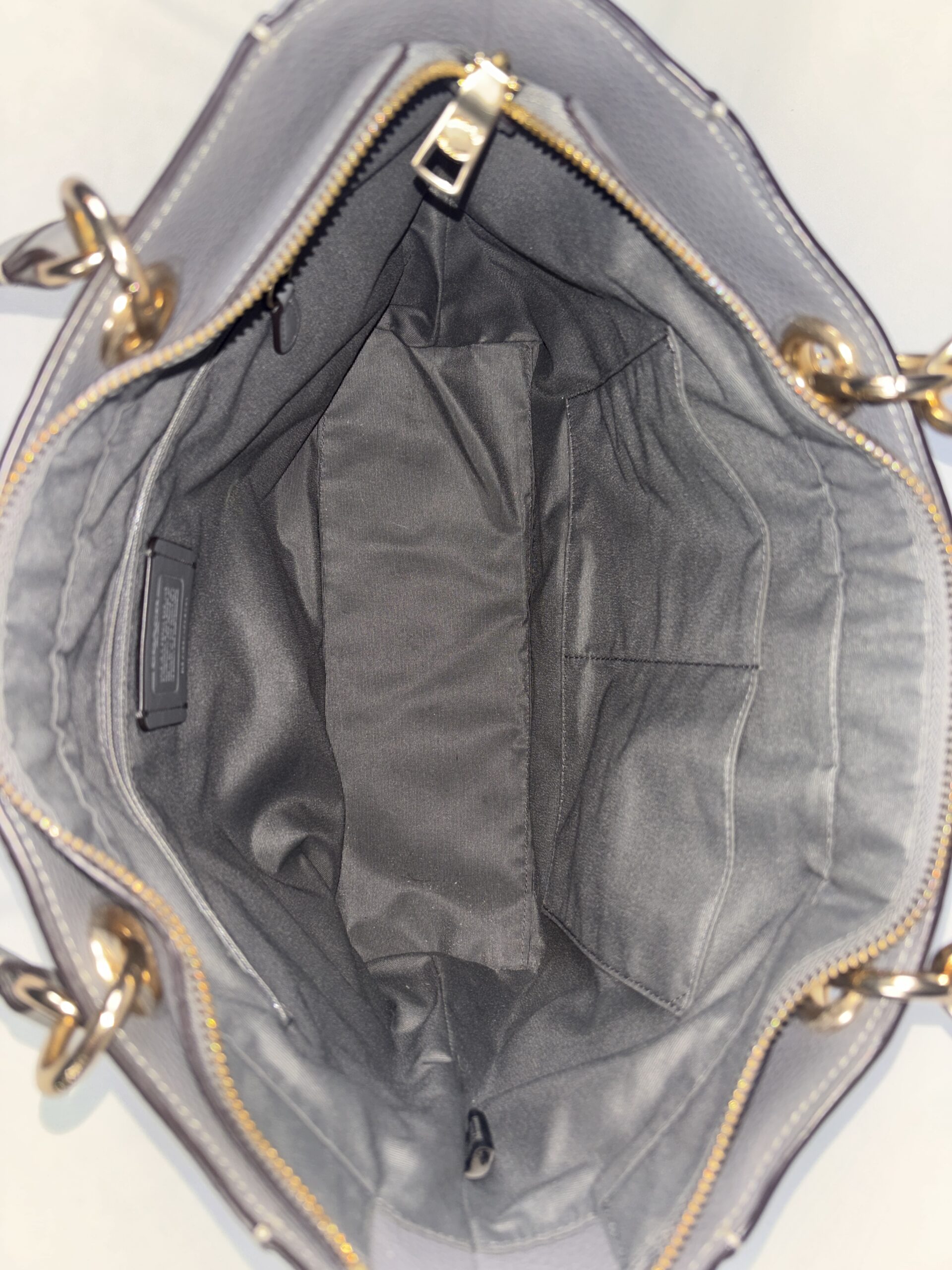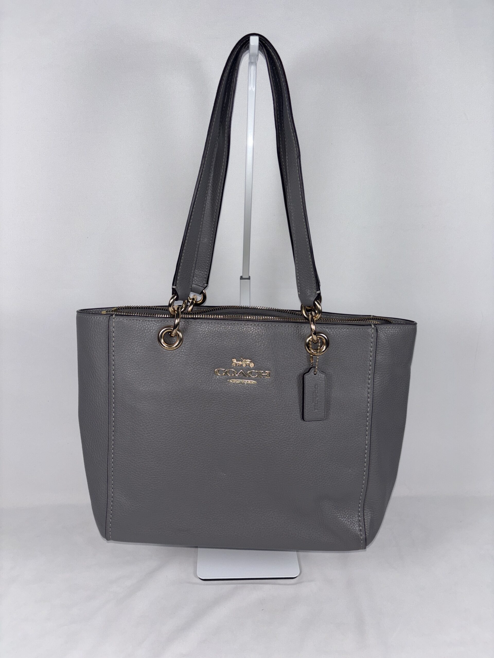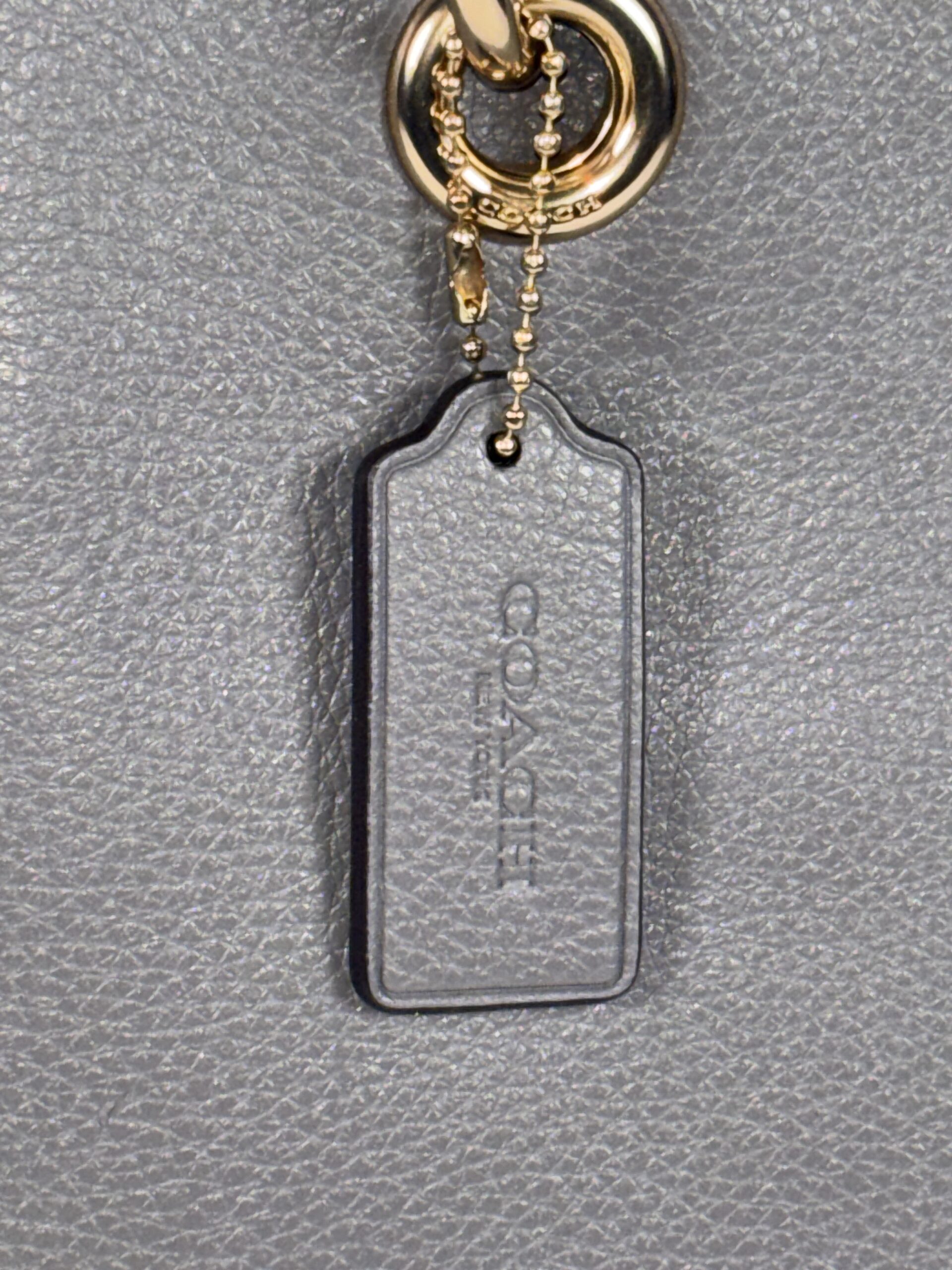 Coach jet tote bag, grey refined pebble leather, gold accents, 1 zipper pocket 2 open pockets
