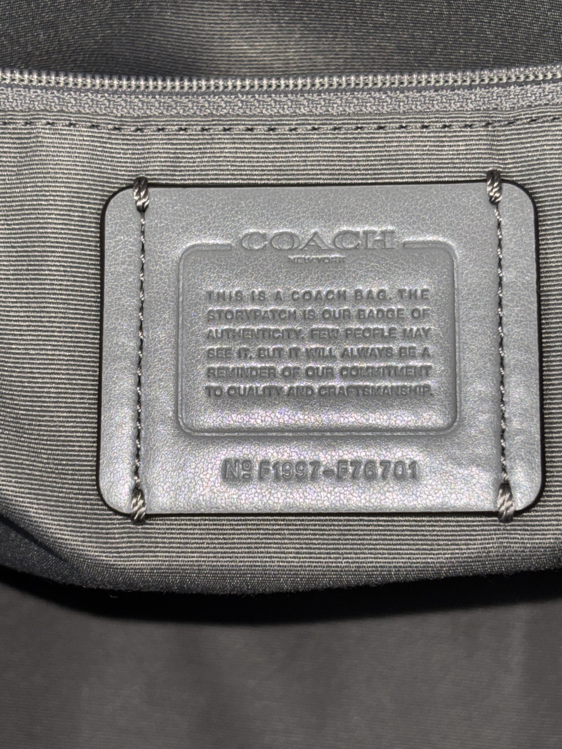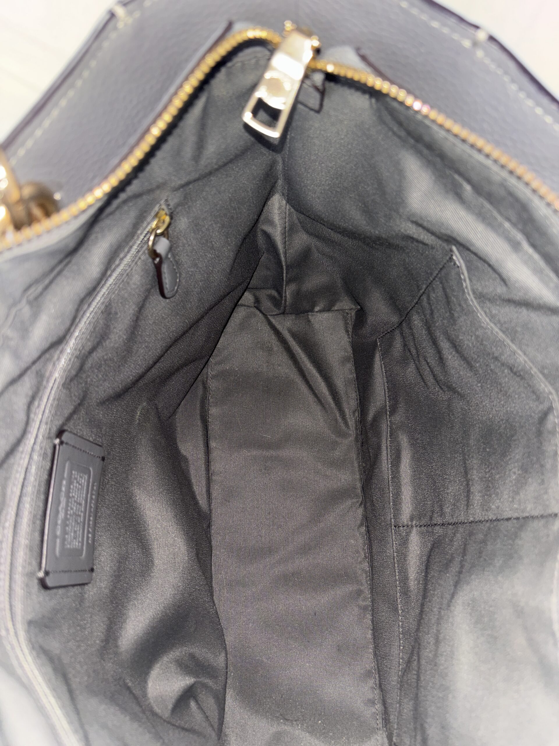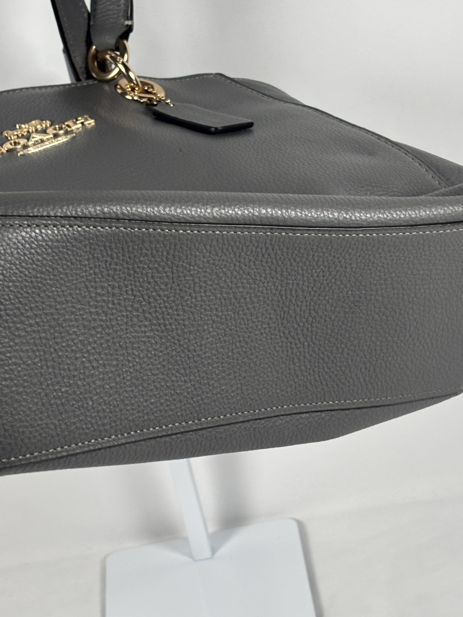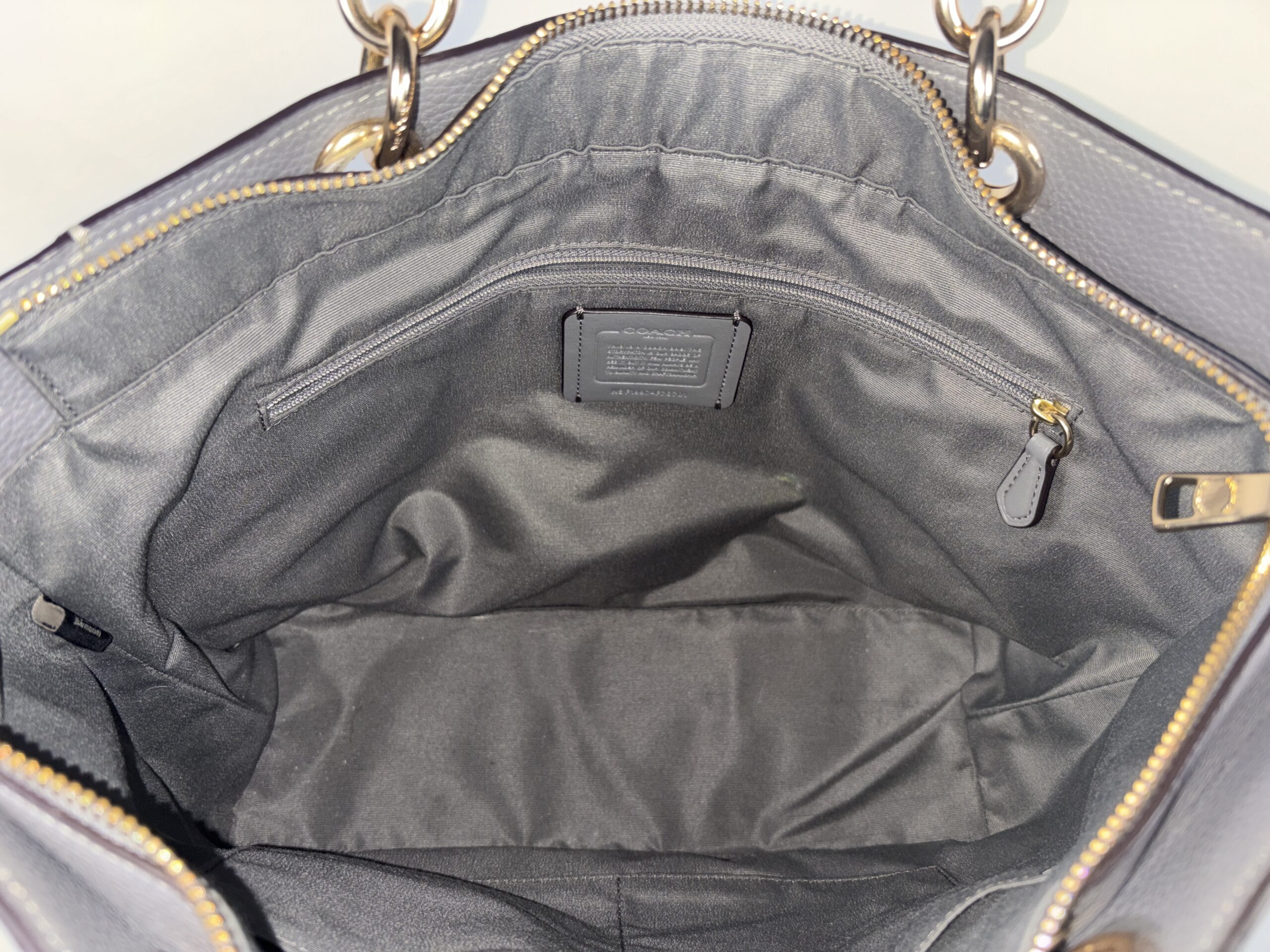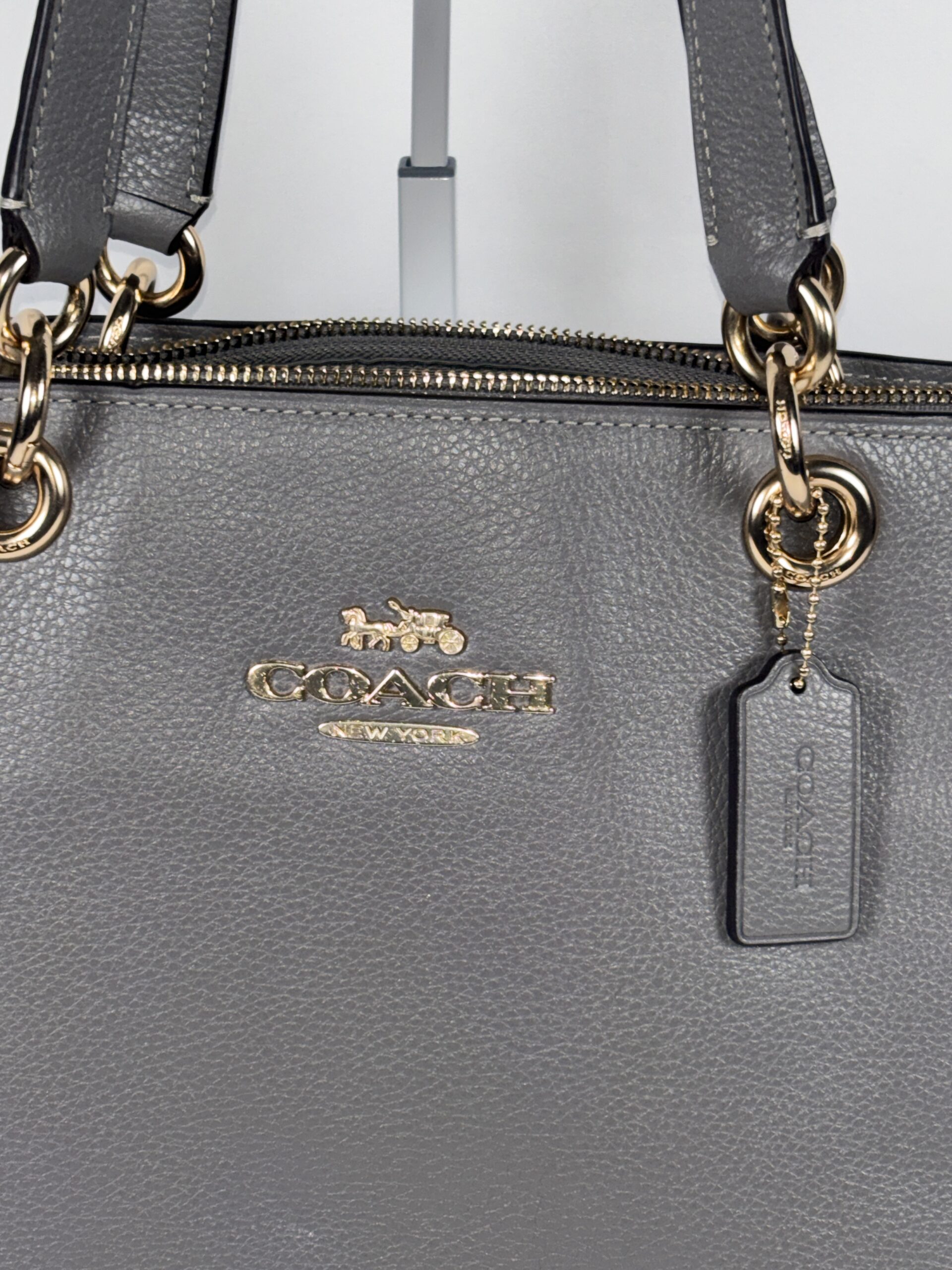 Coach jet tote bag, grey refined pebble leather, gold accents, 1 zipper pocket 2 open pockets