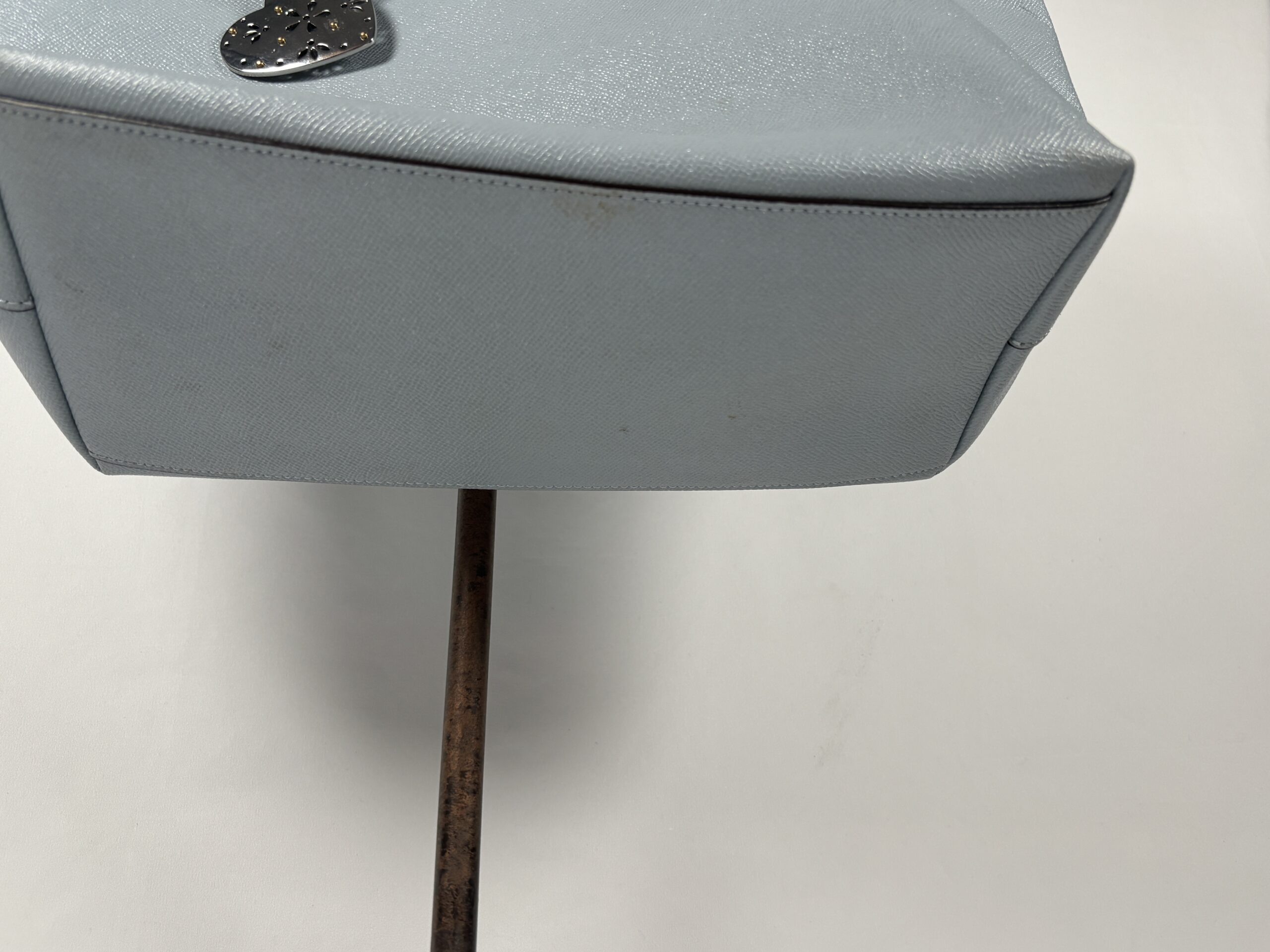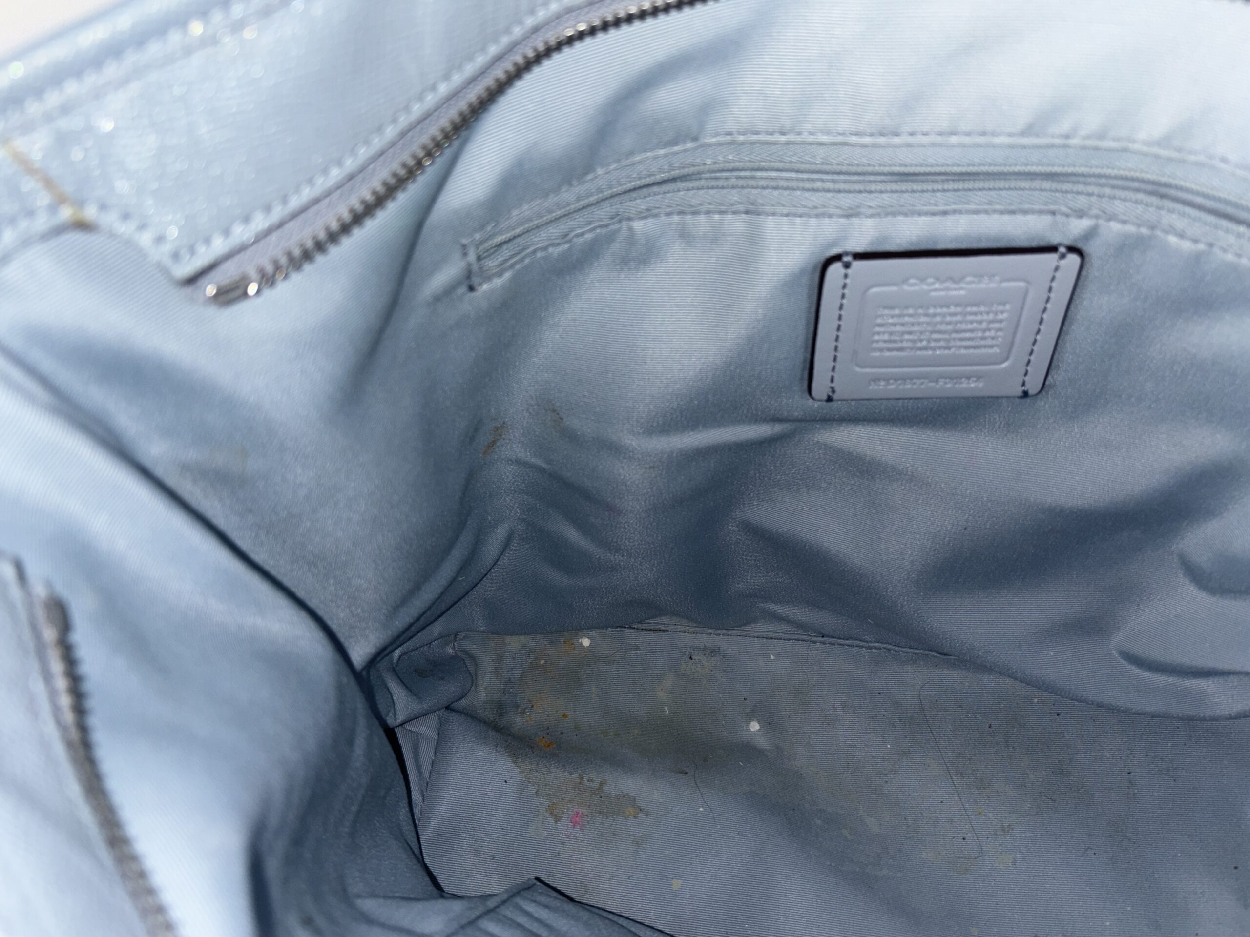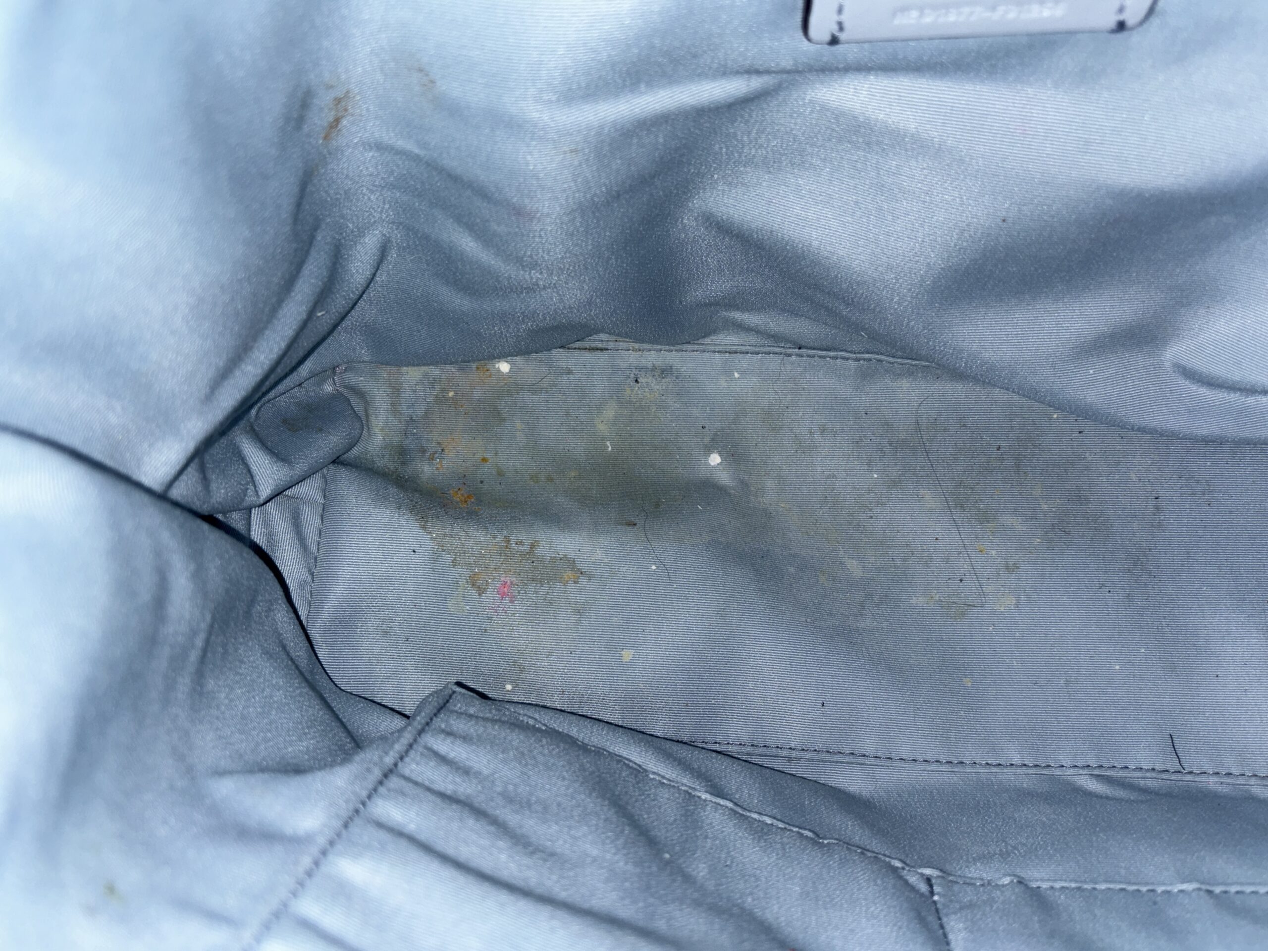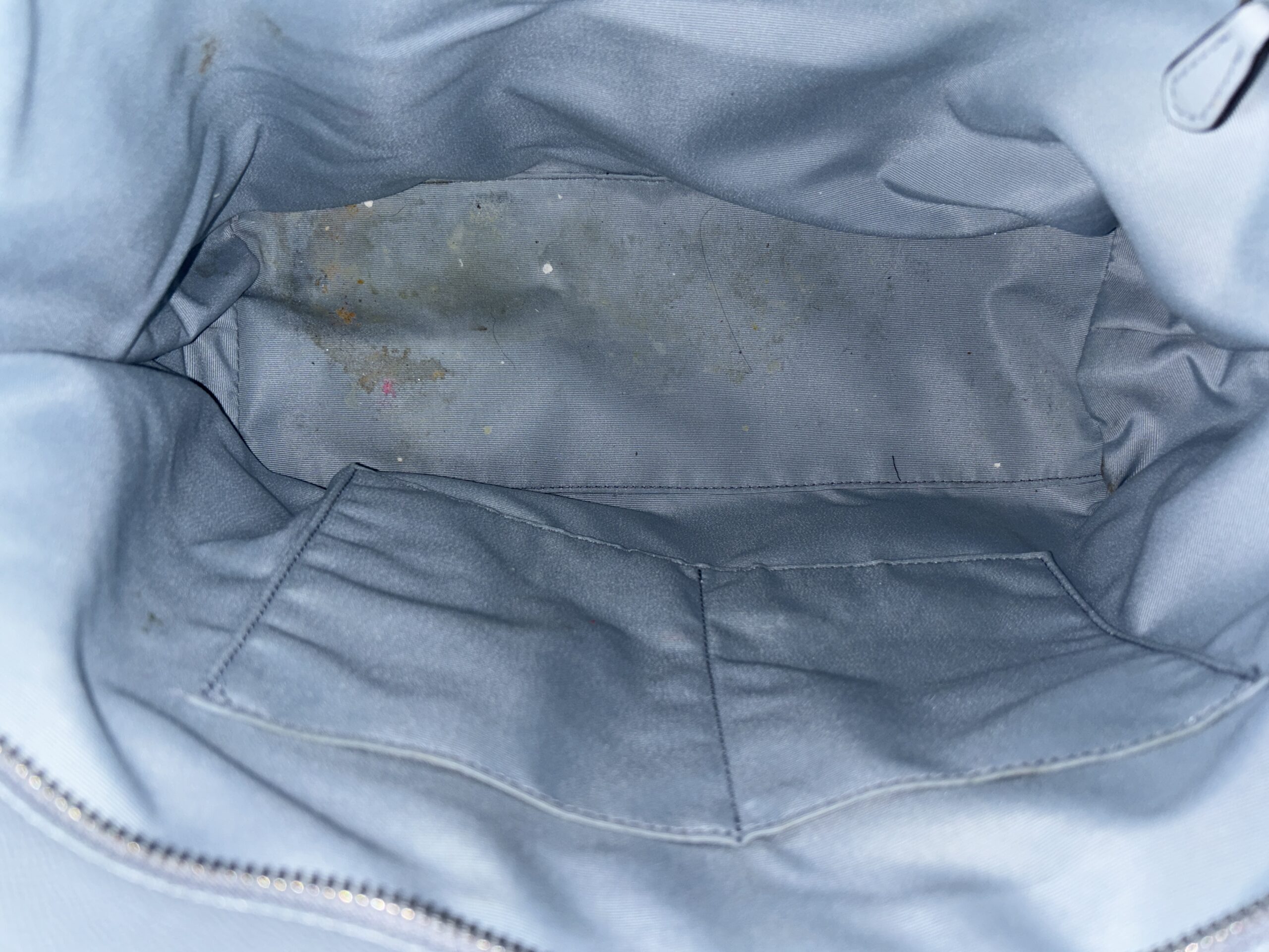Fully leather exterior. Cloth interior, has stains (seen in photo). The bag has one zipper pocket and two pockets inside. It comes with a fully leather wallet. It has one pocket on the outside back and one zipper pocket inside.