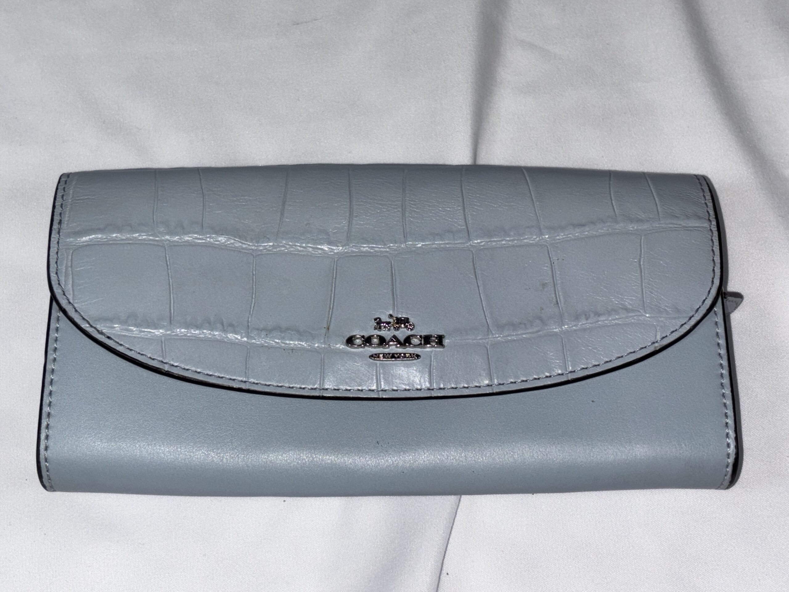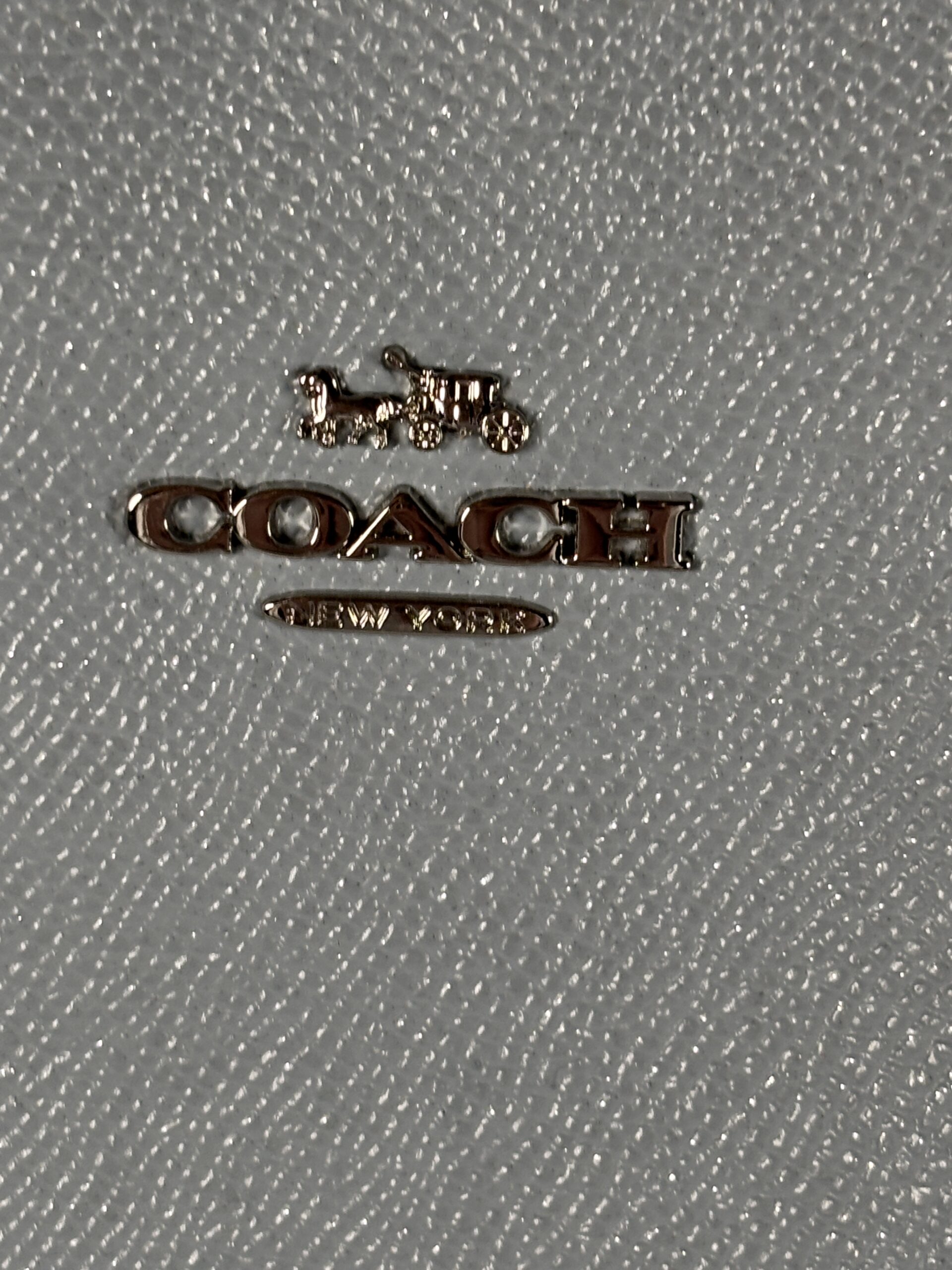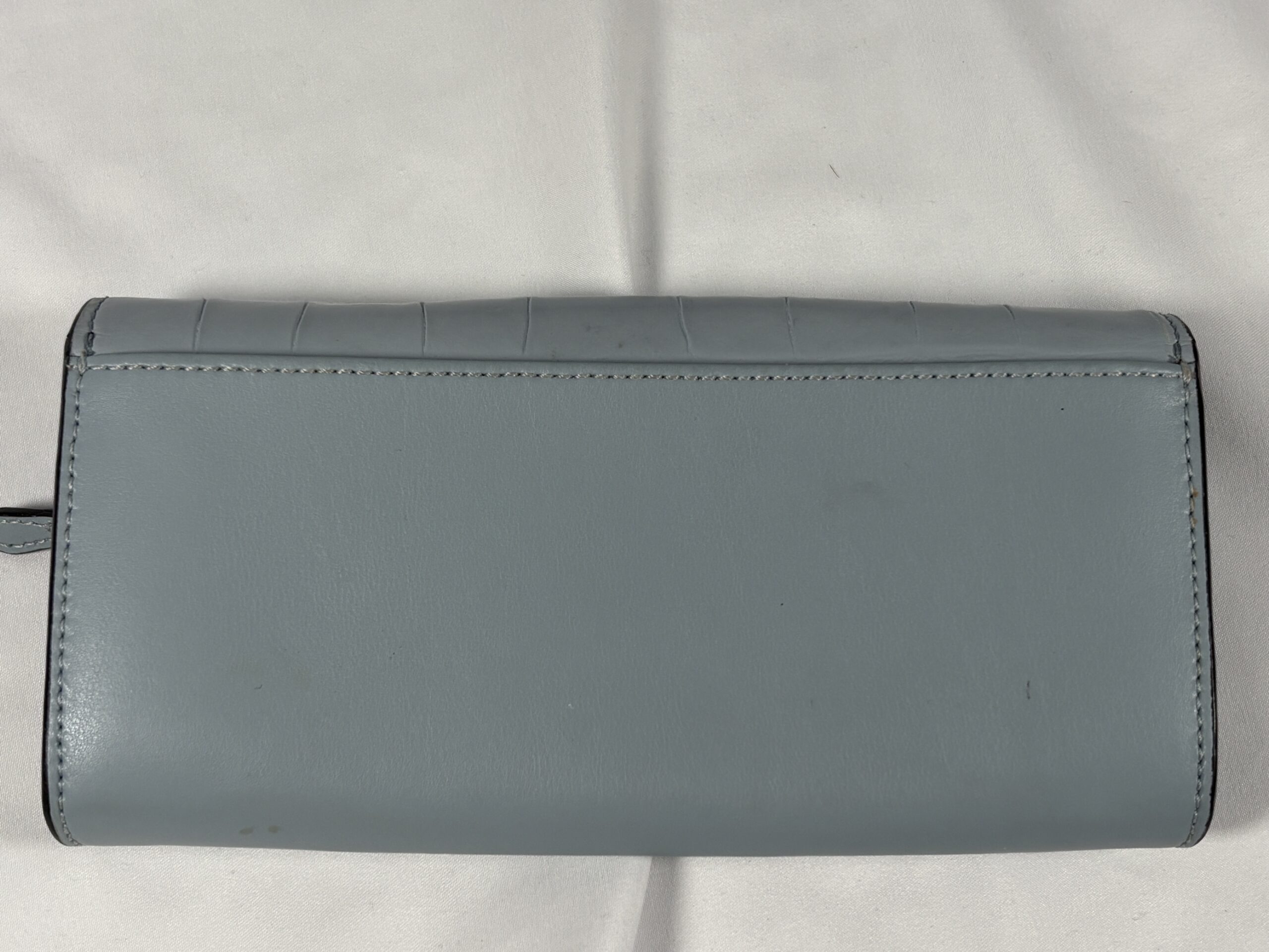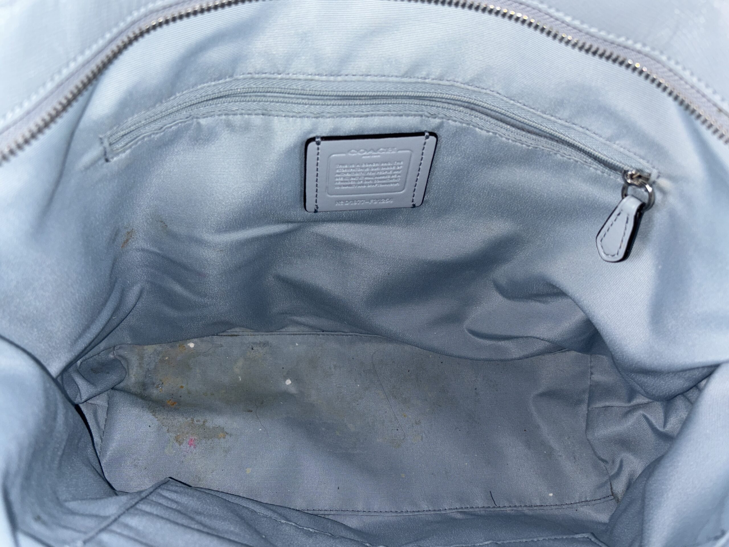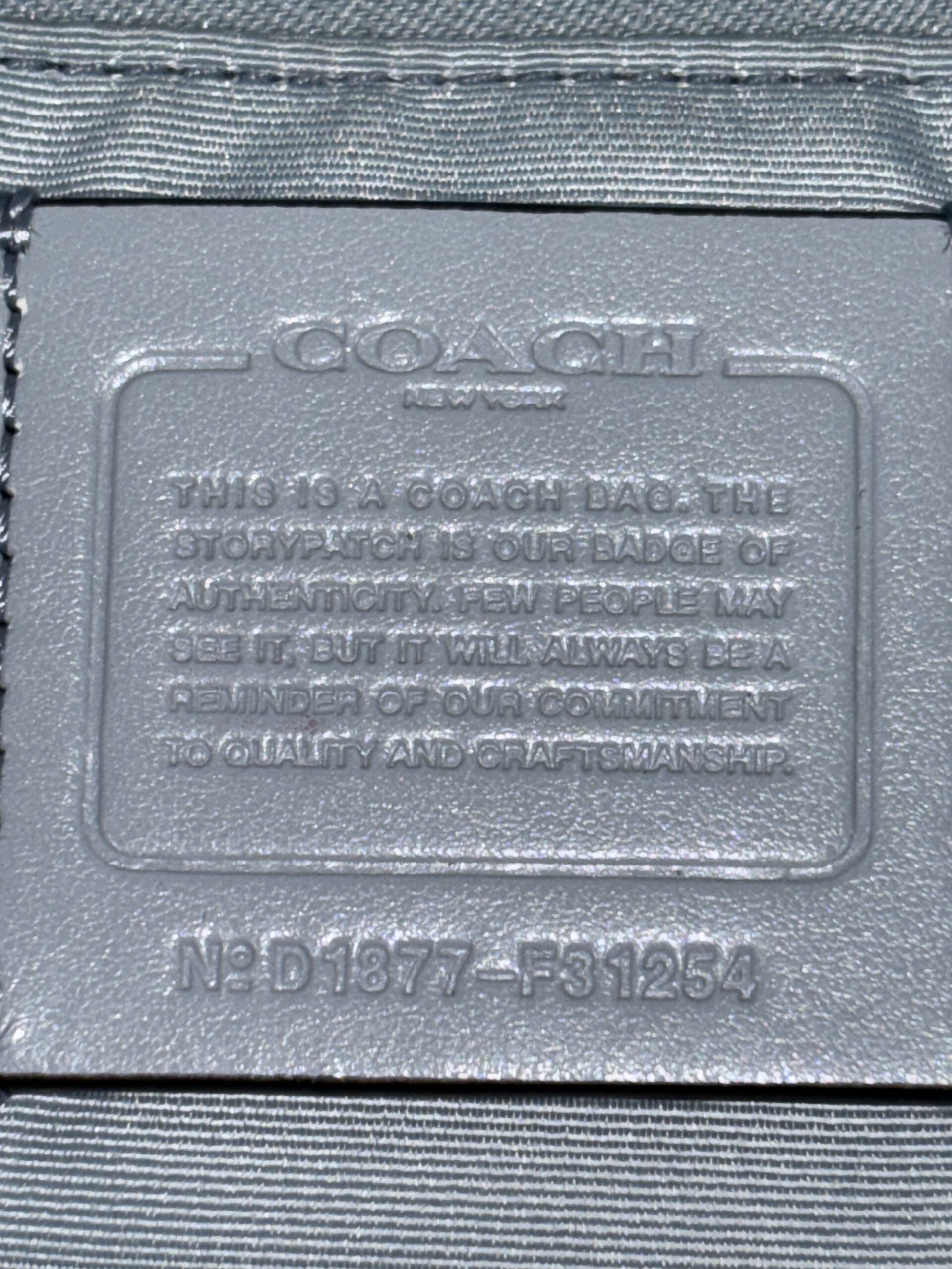 Fully leather exterior. Cloth interior, has stains (seen in photo). The bag has one zipper pocket and two pockets inside. It comes with a fully leather wallet. It has one pocket on the outside back and one zipper pocket inside.