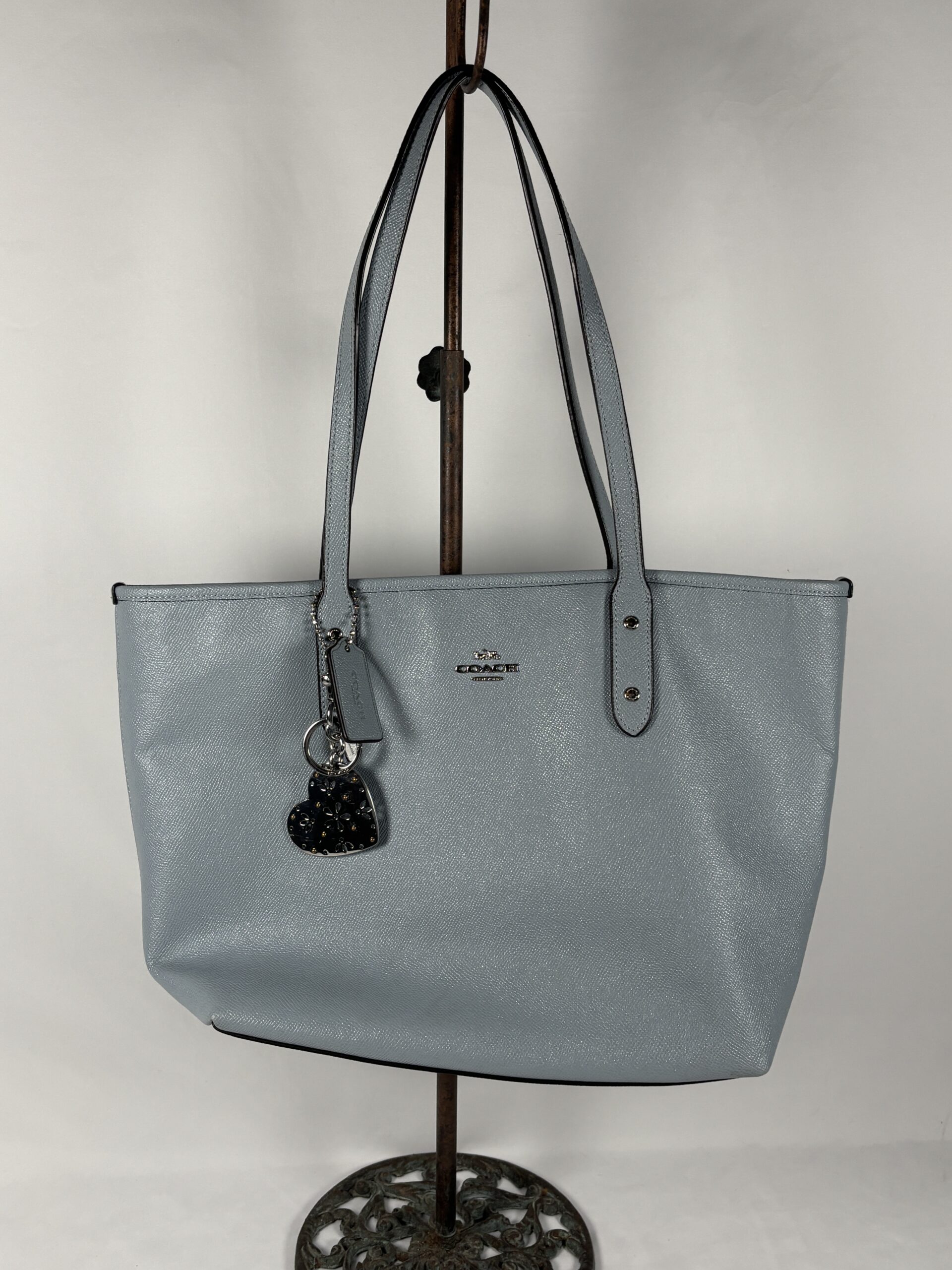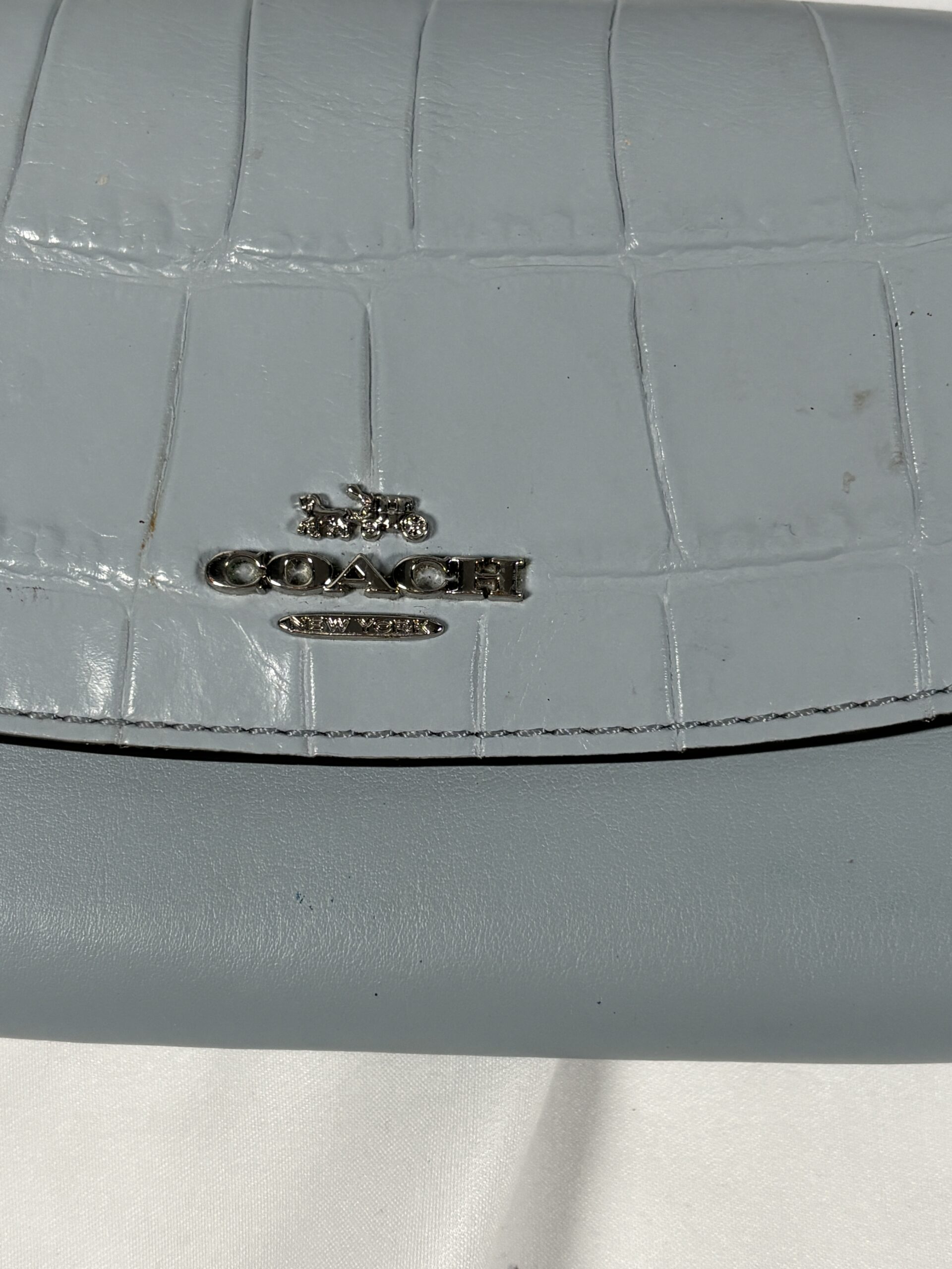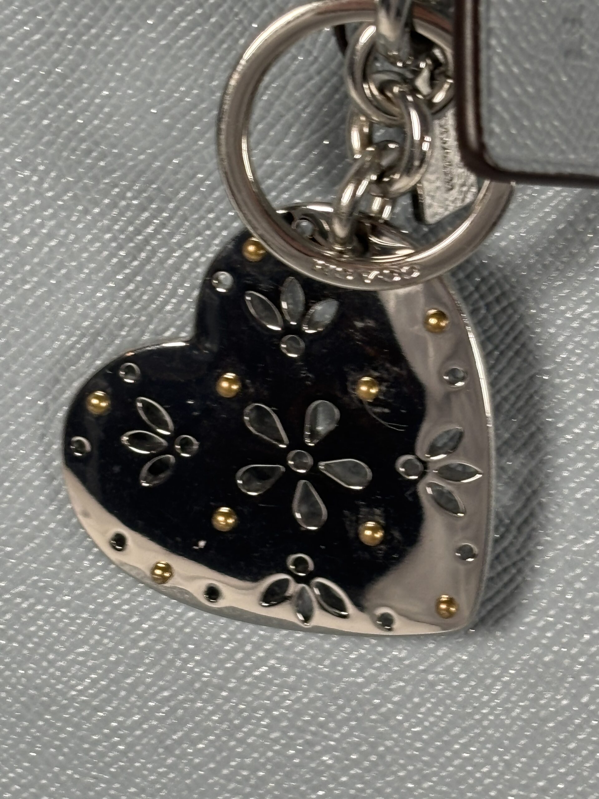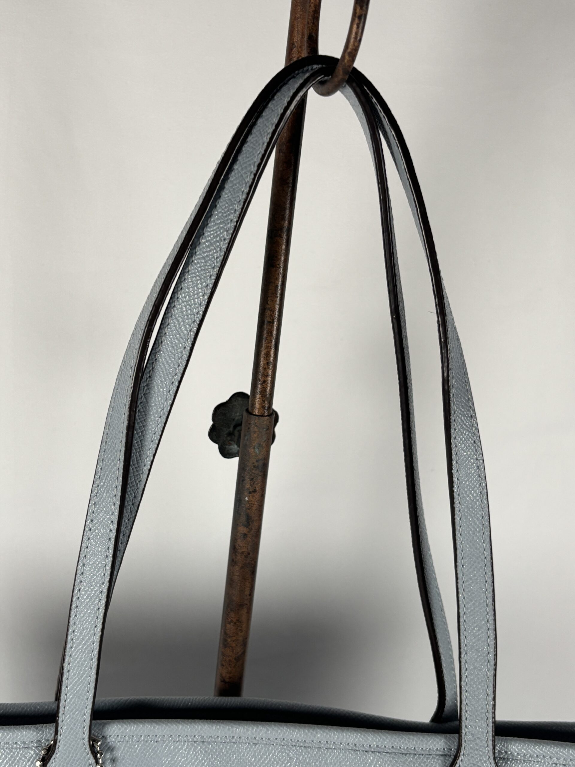 Fully leather exterior. Cloth interior, has stains (seen in photo). The bag has one zipper pocket and two pockets inside. It comes with a fully leather wallet. It has one pocket on the outside back and one zipper pocket inside.