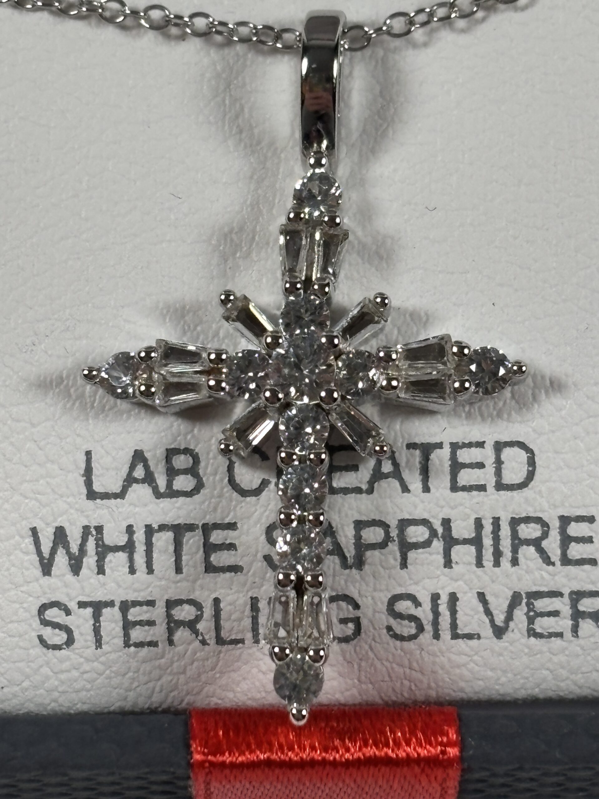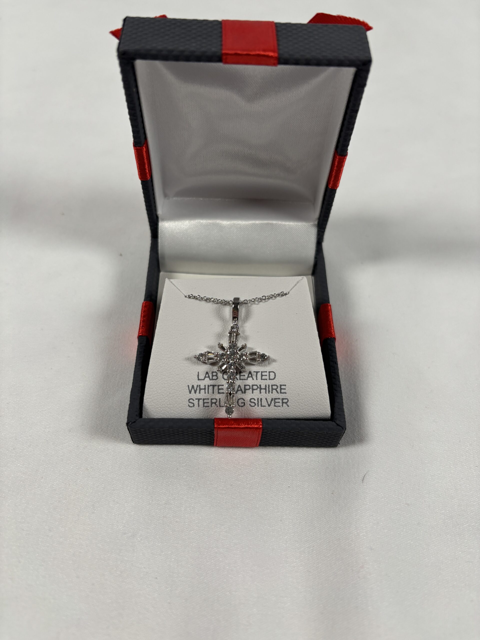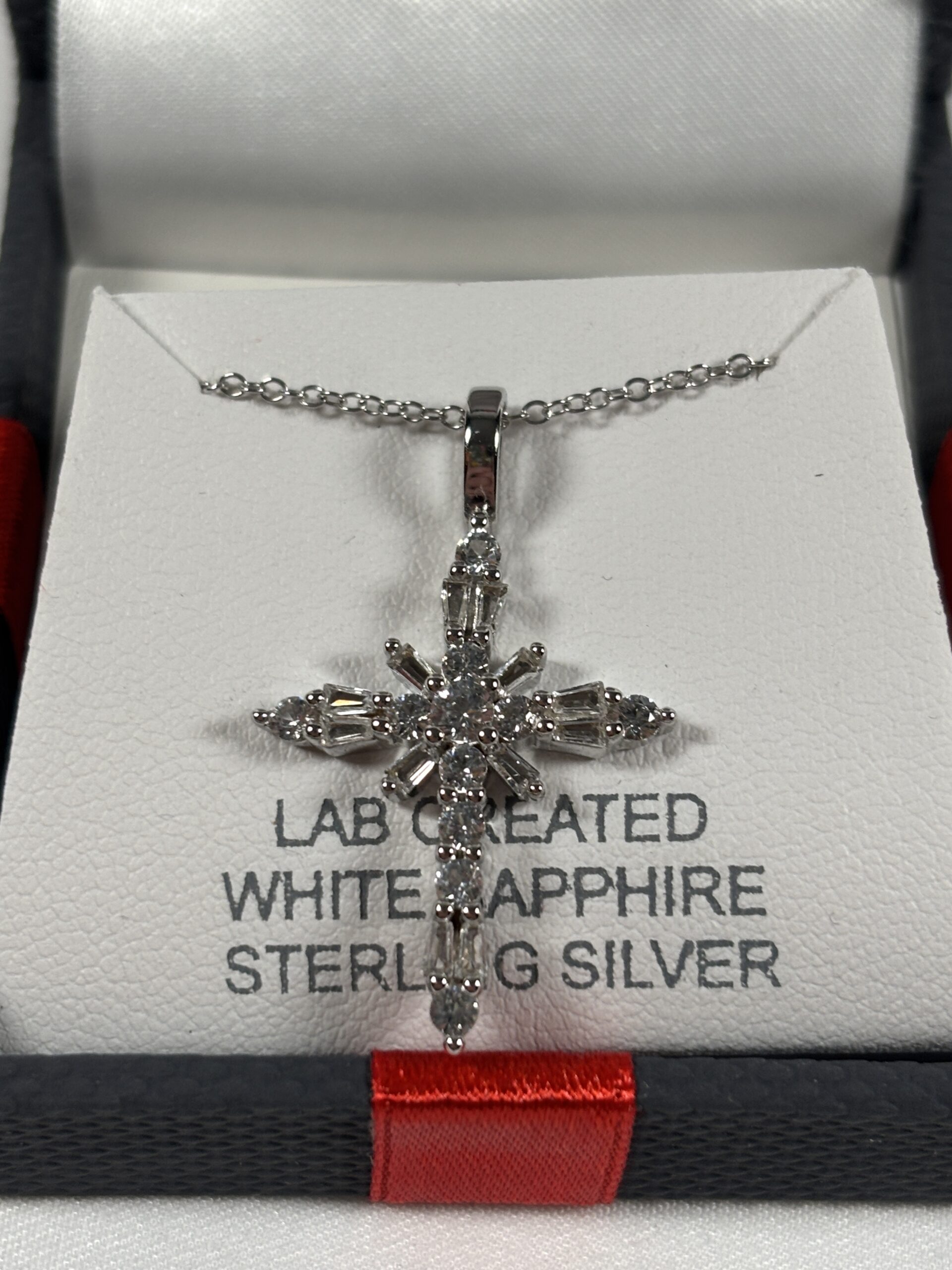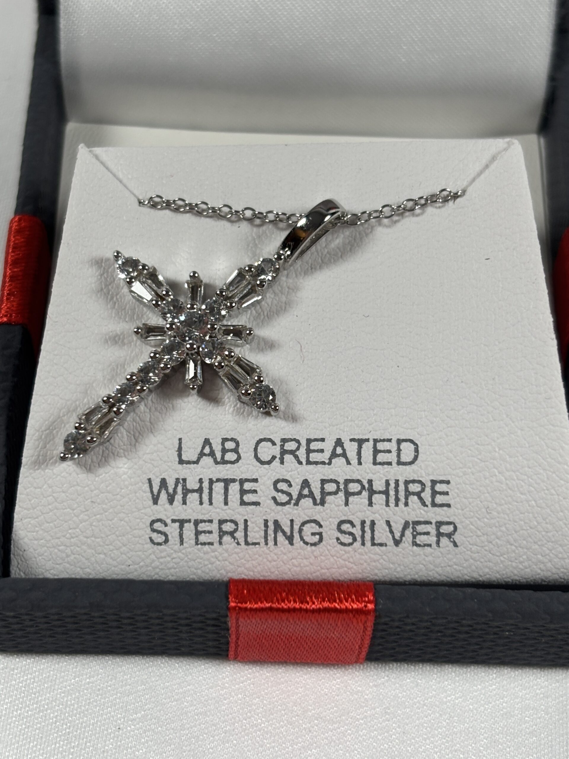 Lab created. White sapphire sterling silver. Comes in box.