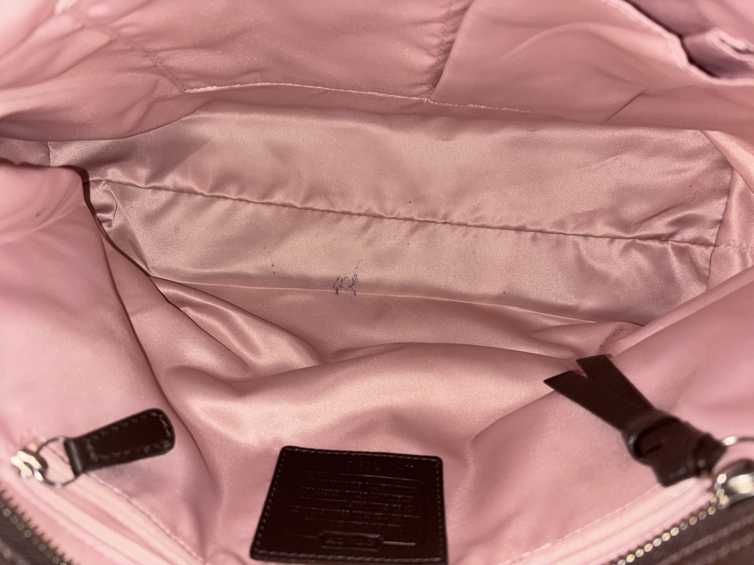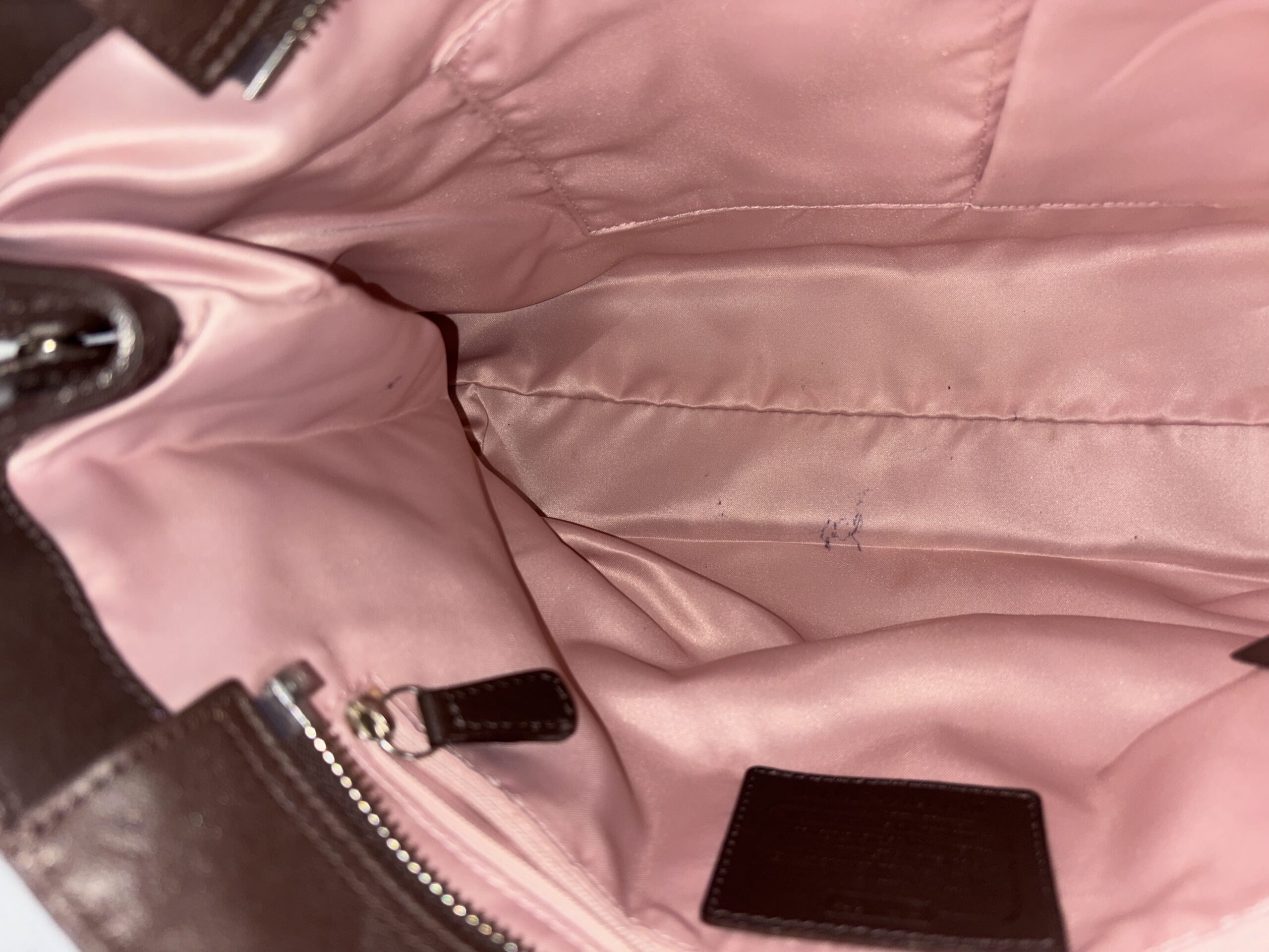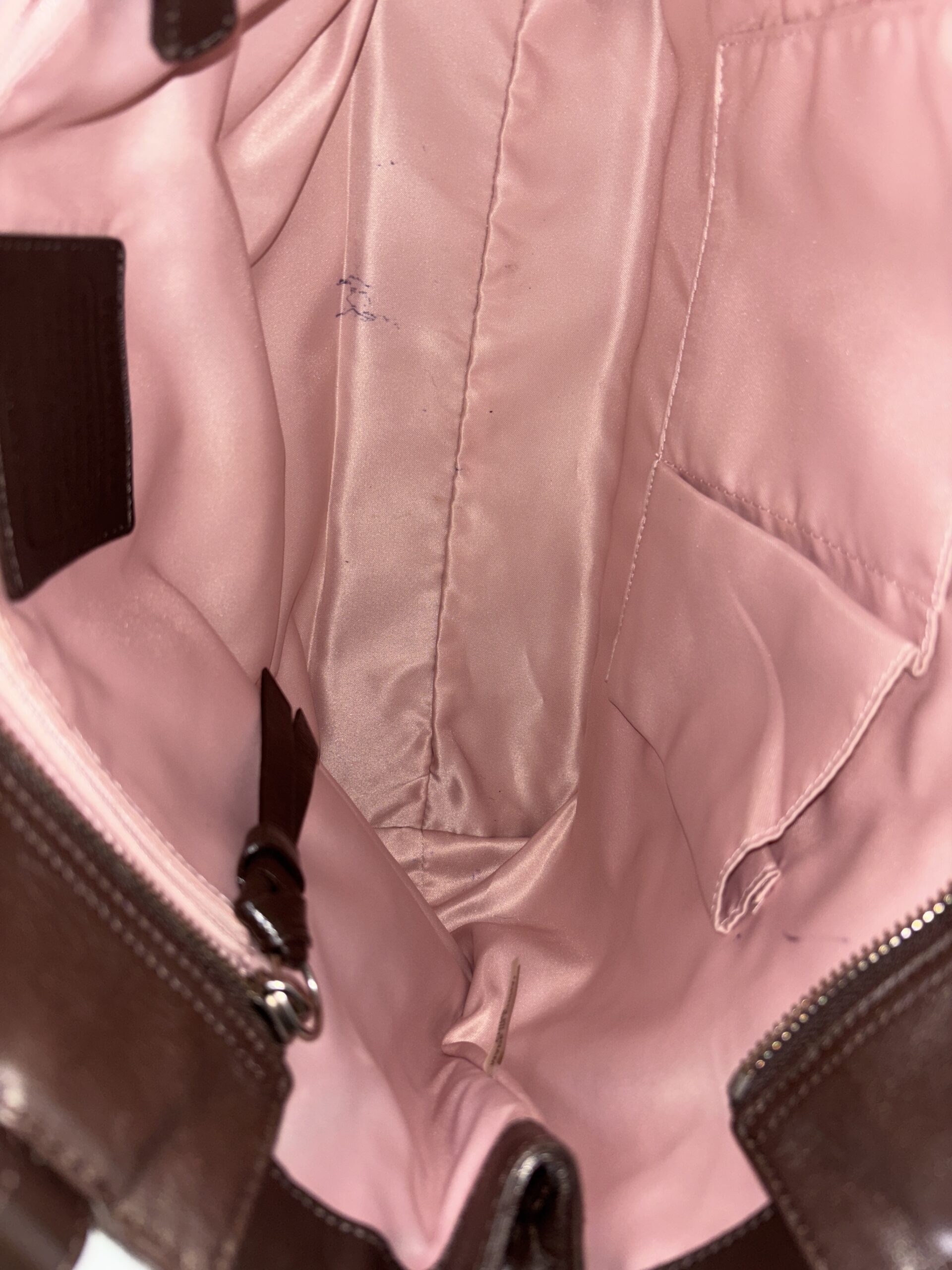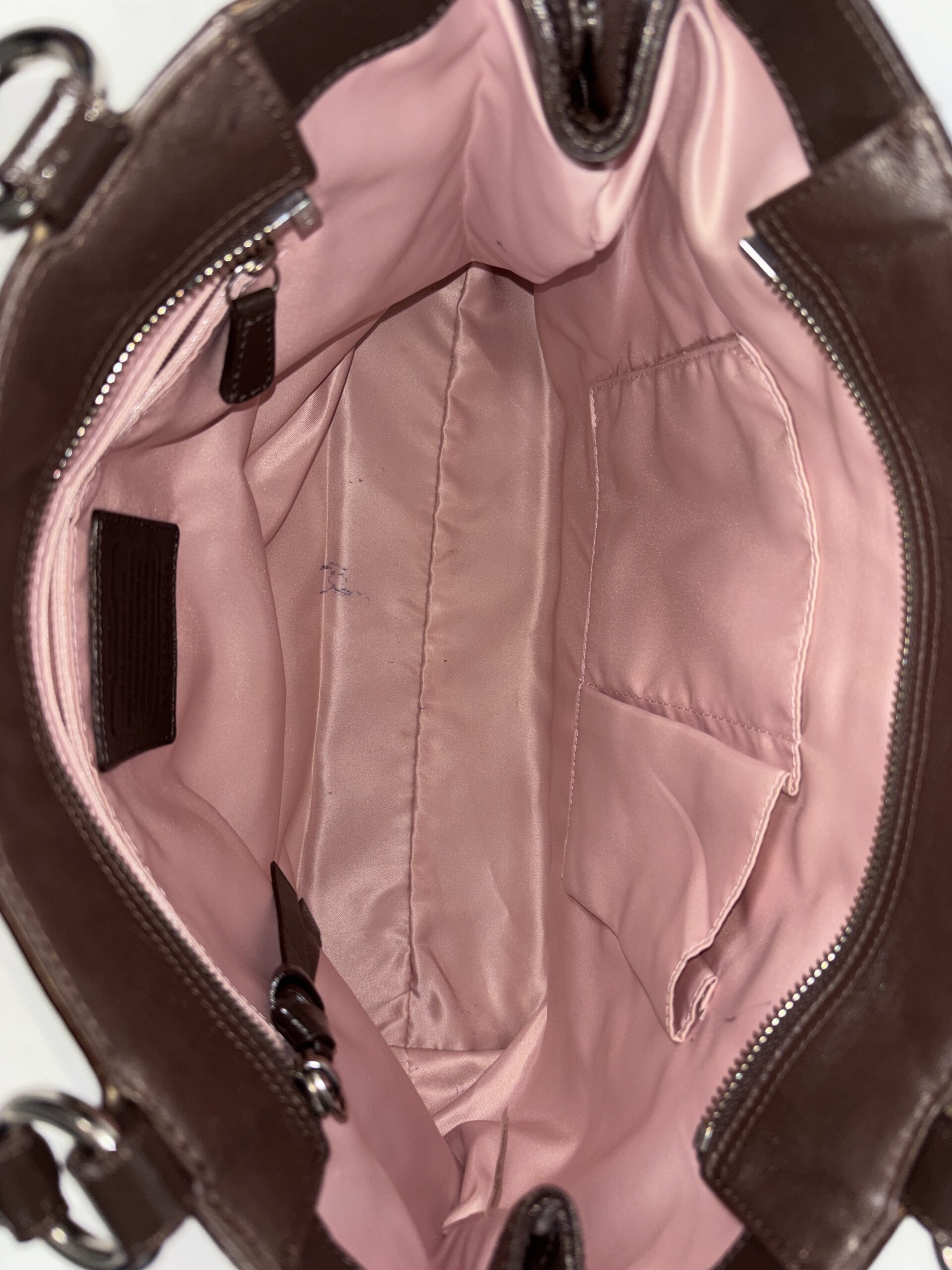 Brown leather exterior, pink satin like interior, silver hardware, 3 interior pockets, 2 open face 1 zipper