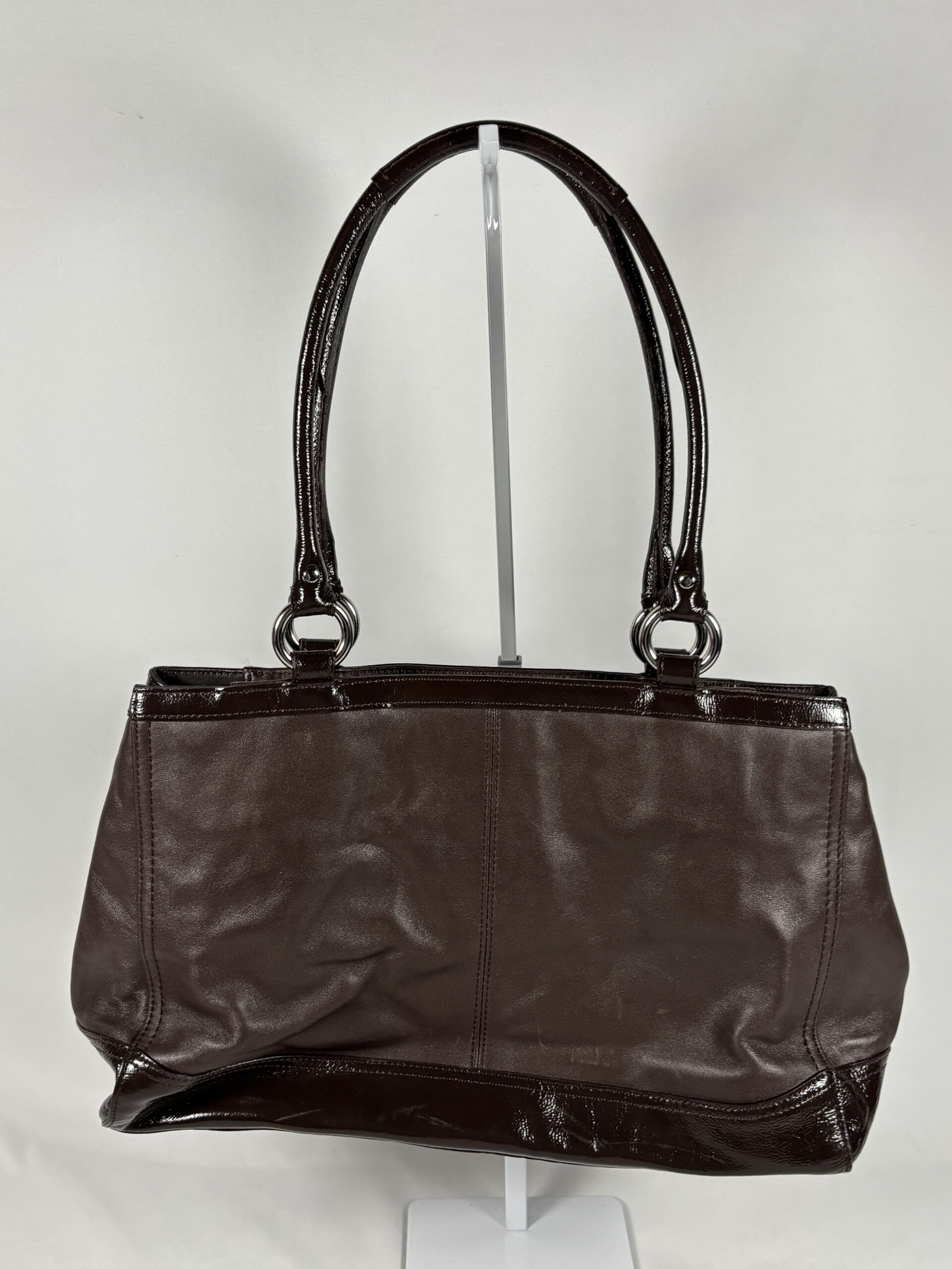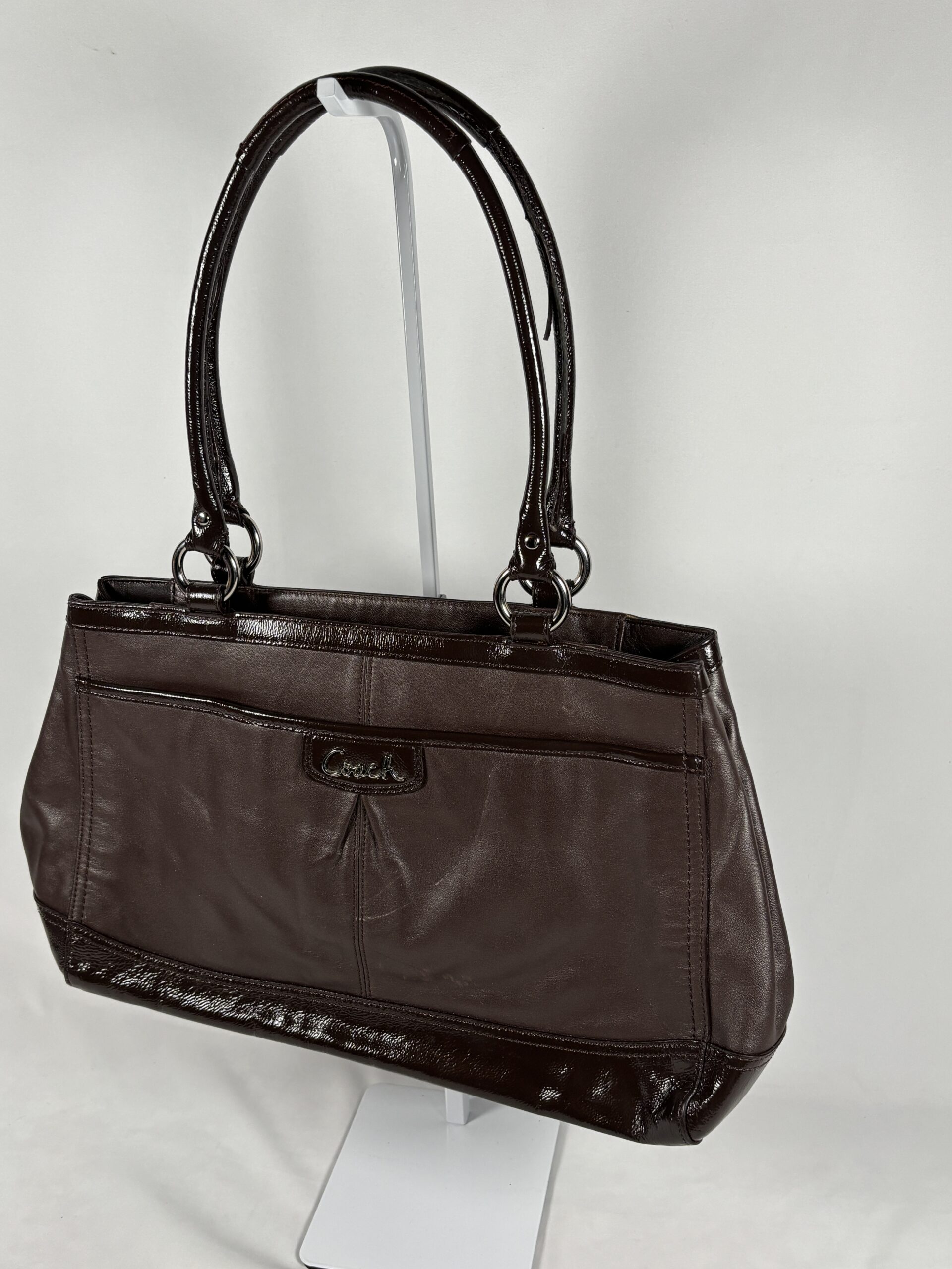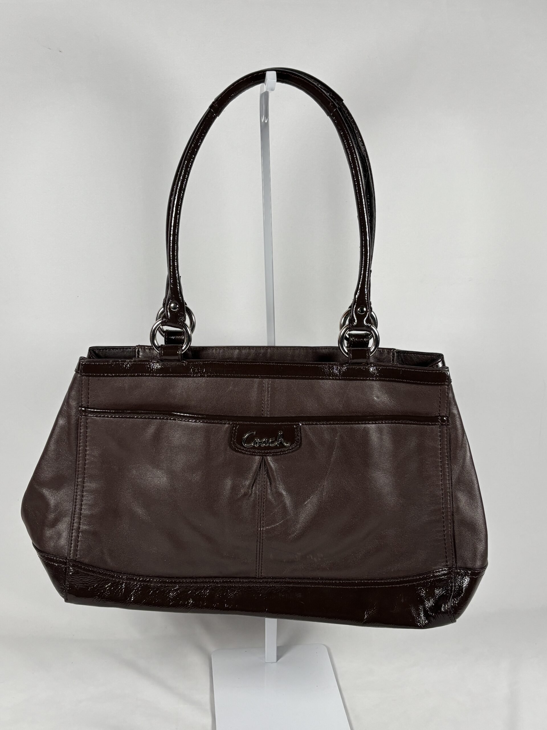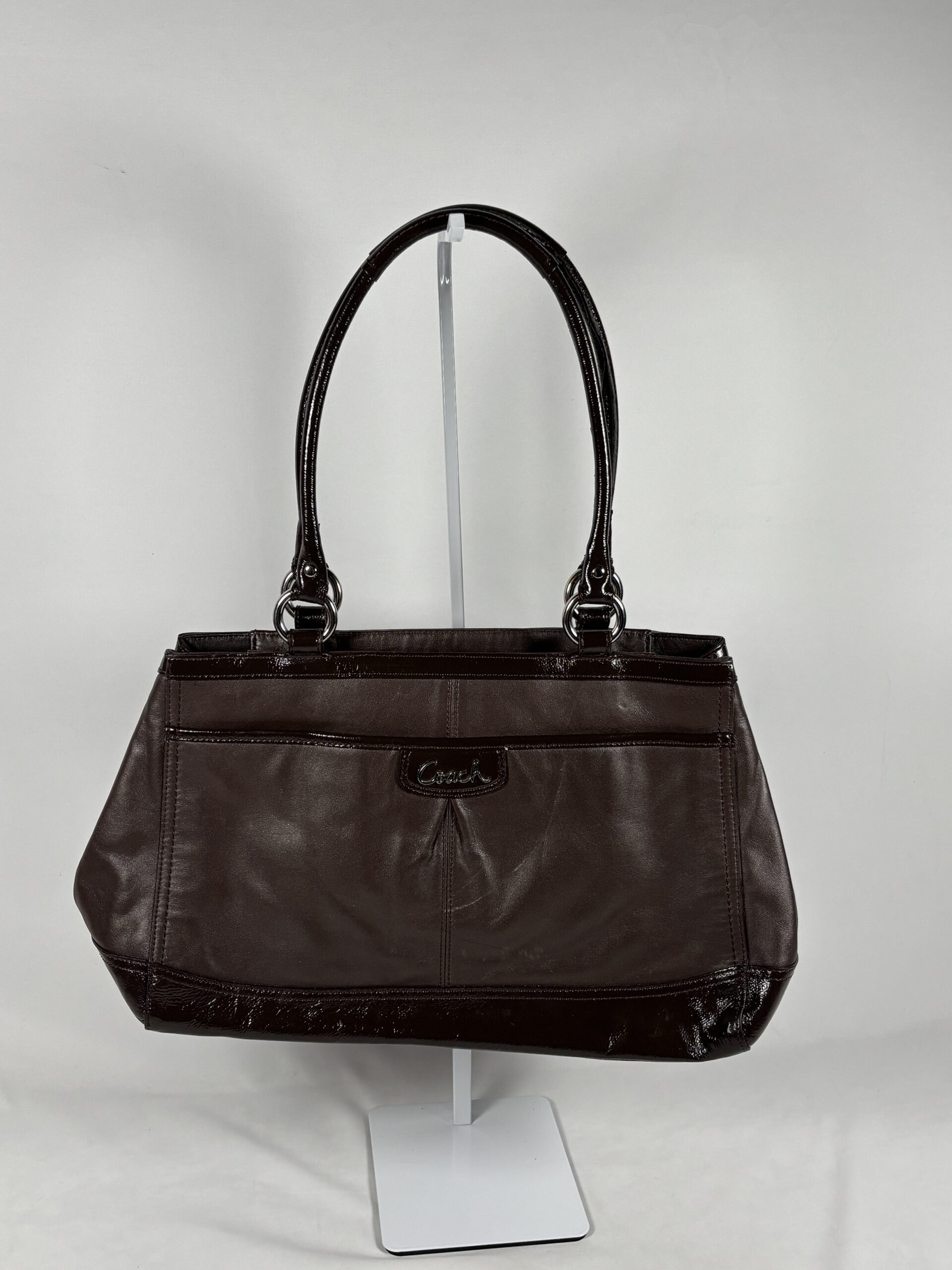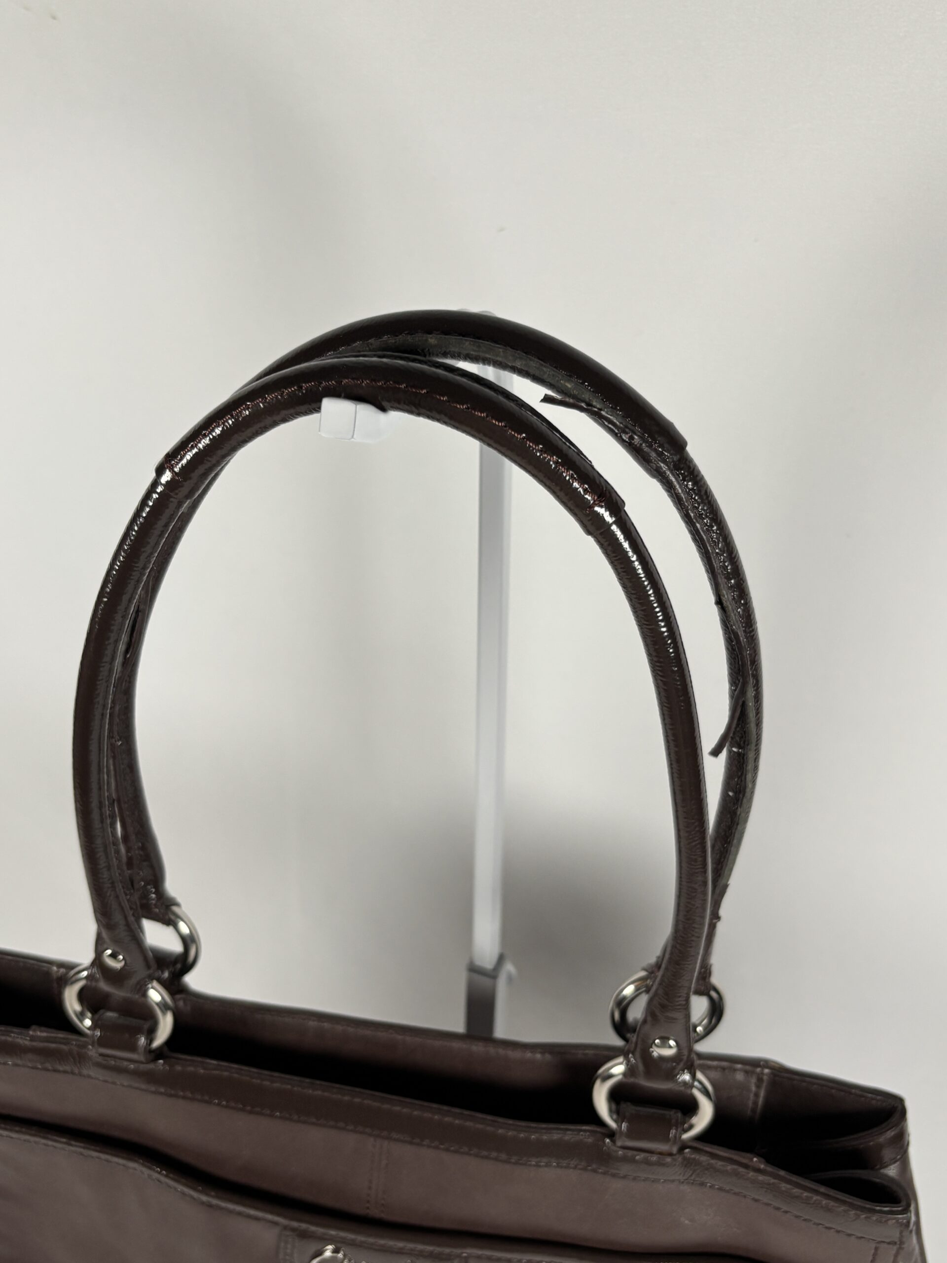 Brown leather exterior, pink satin like interior, silver hardware, 3 interior pockets, 2 open face 1 zipper