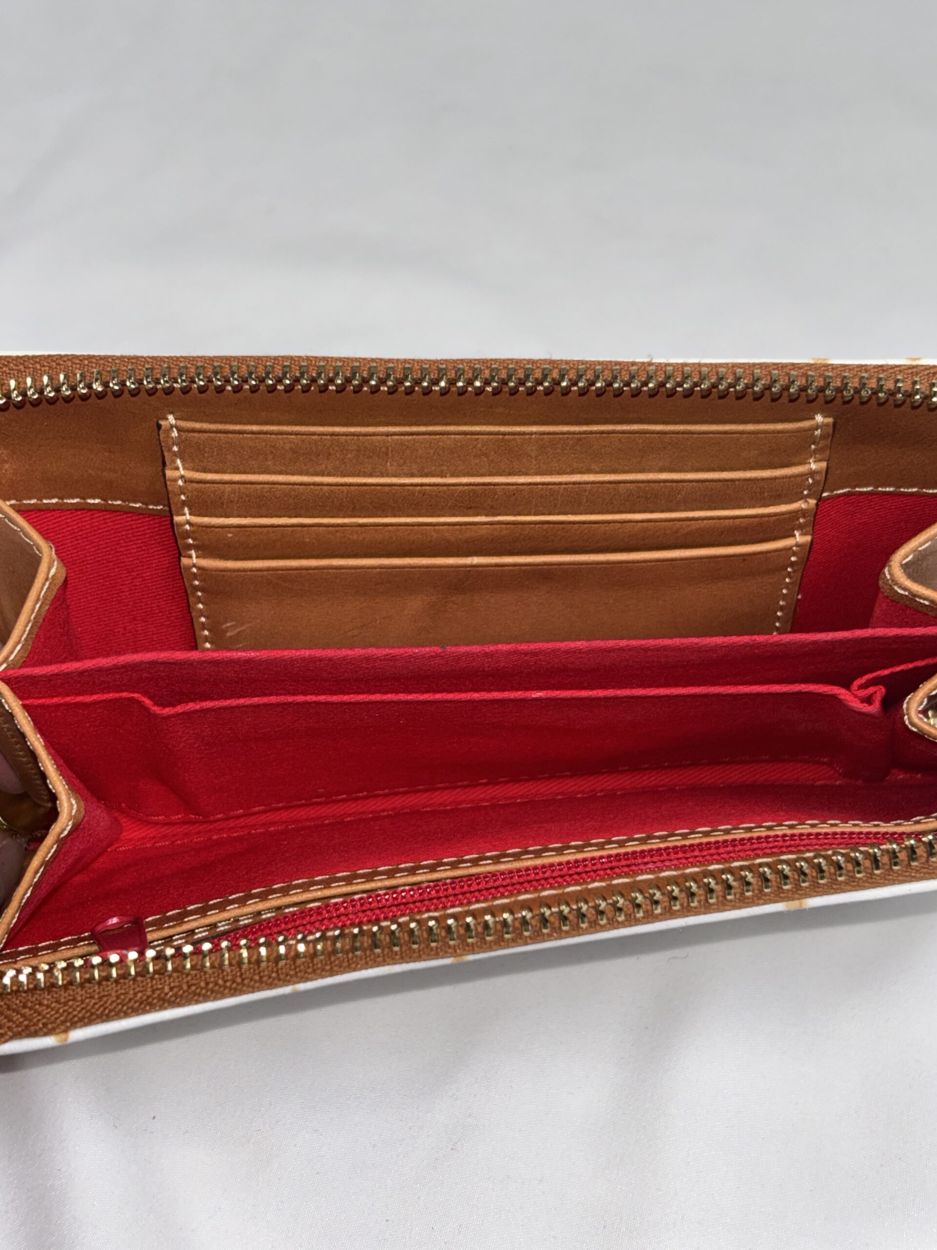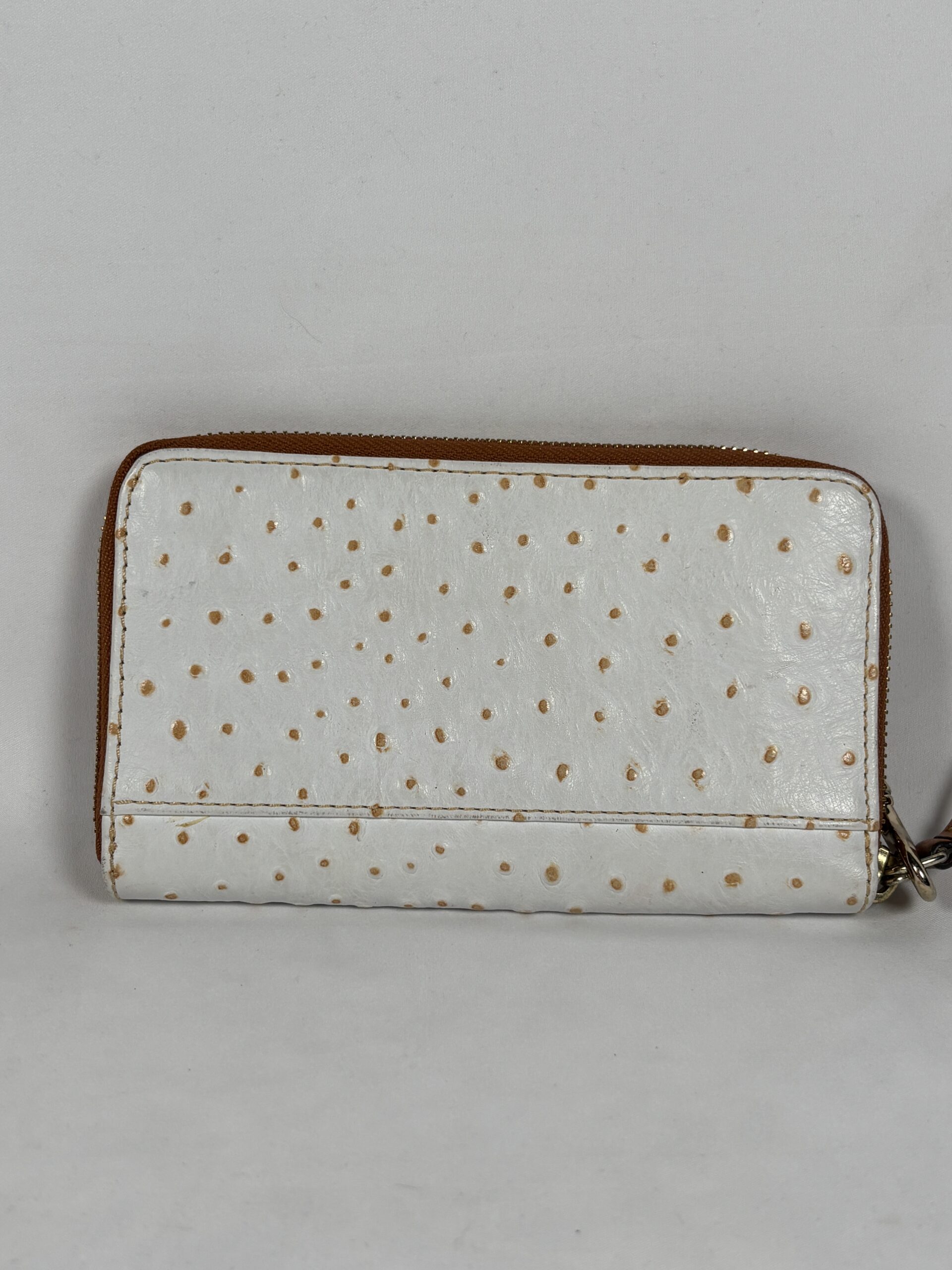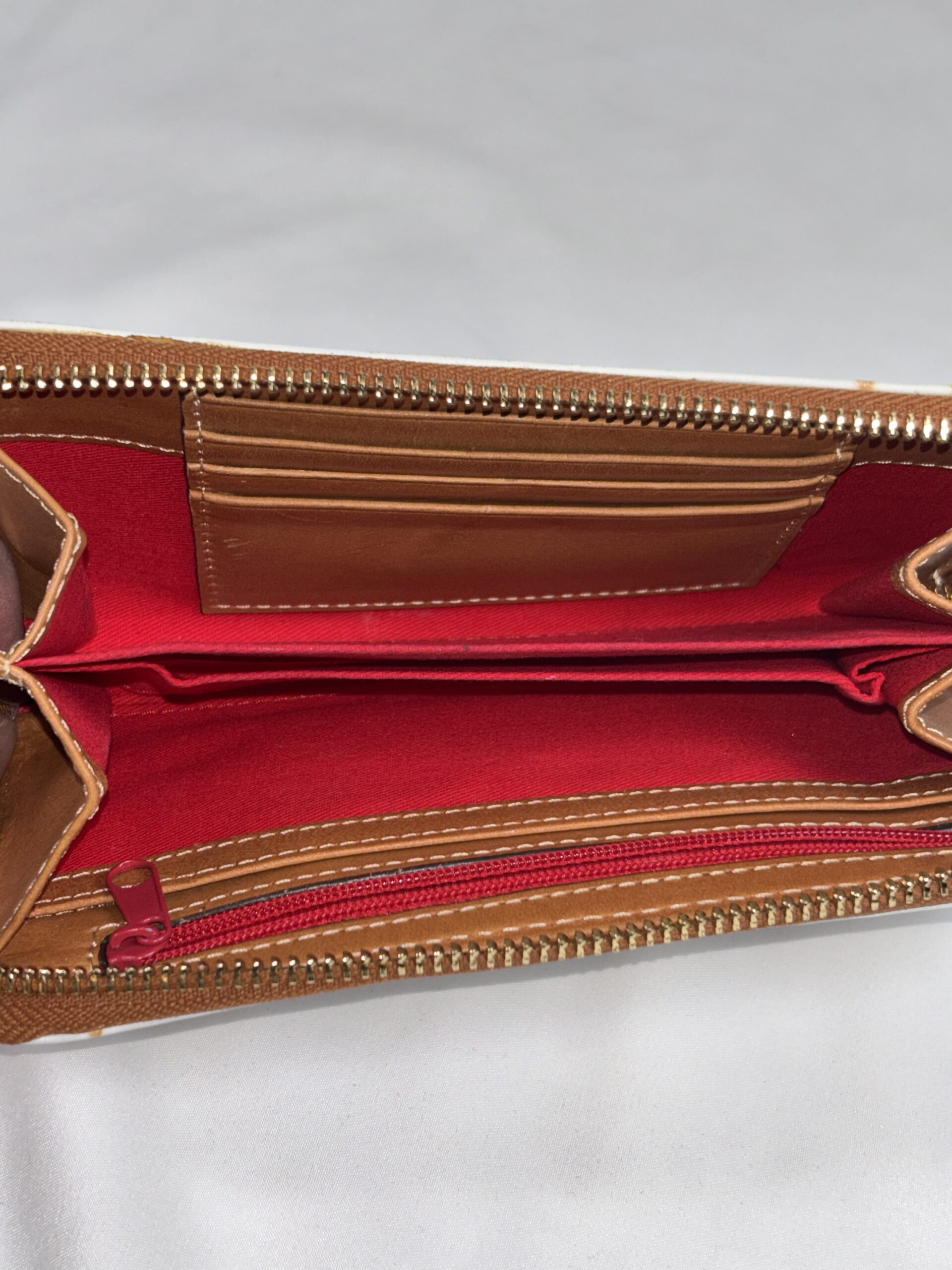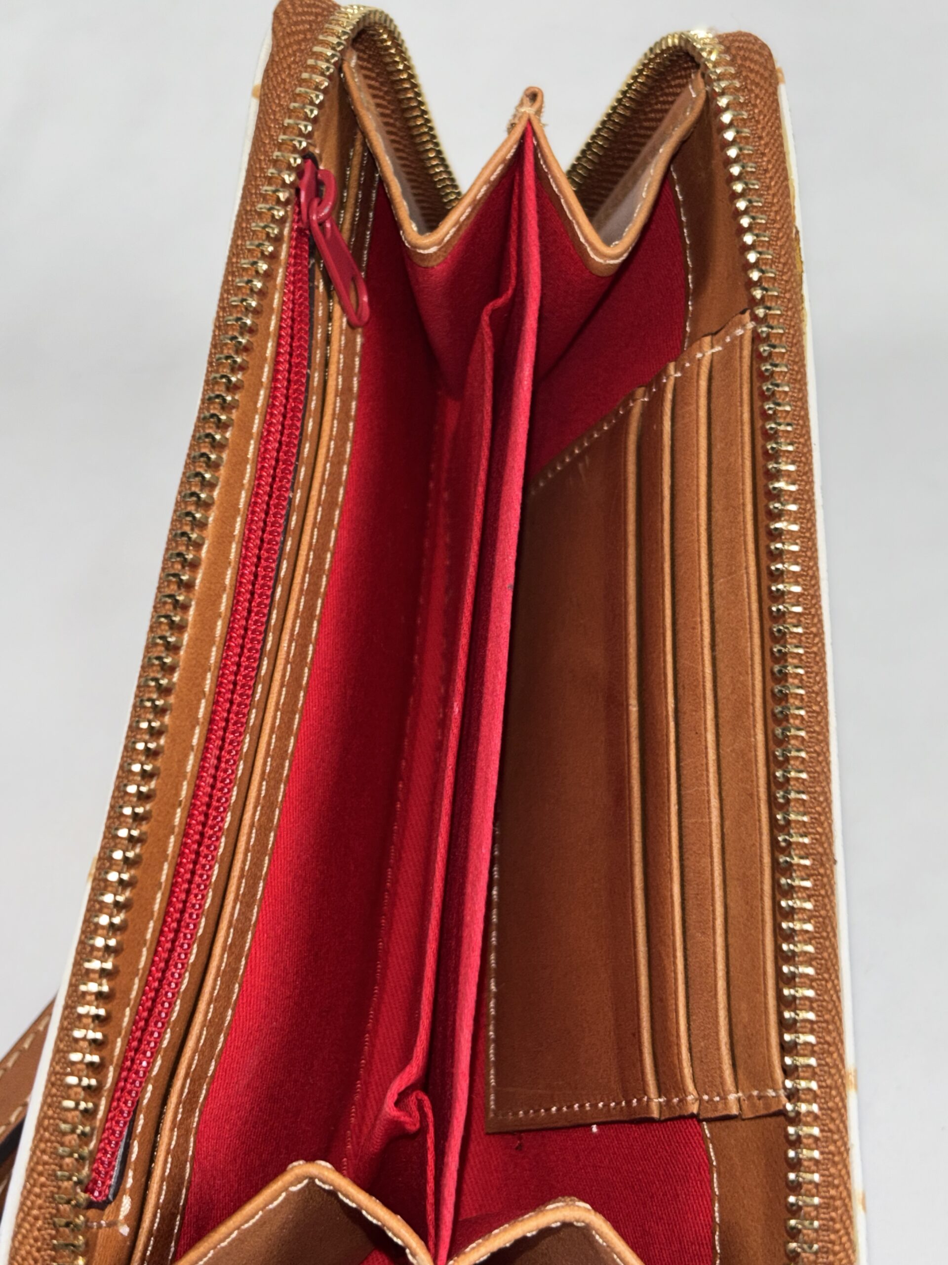 White with light brown accents, over the top zipper, multiple interior card slots