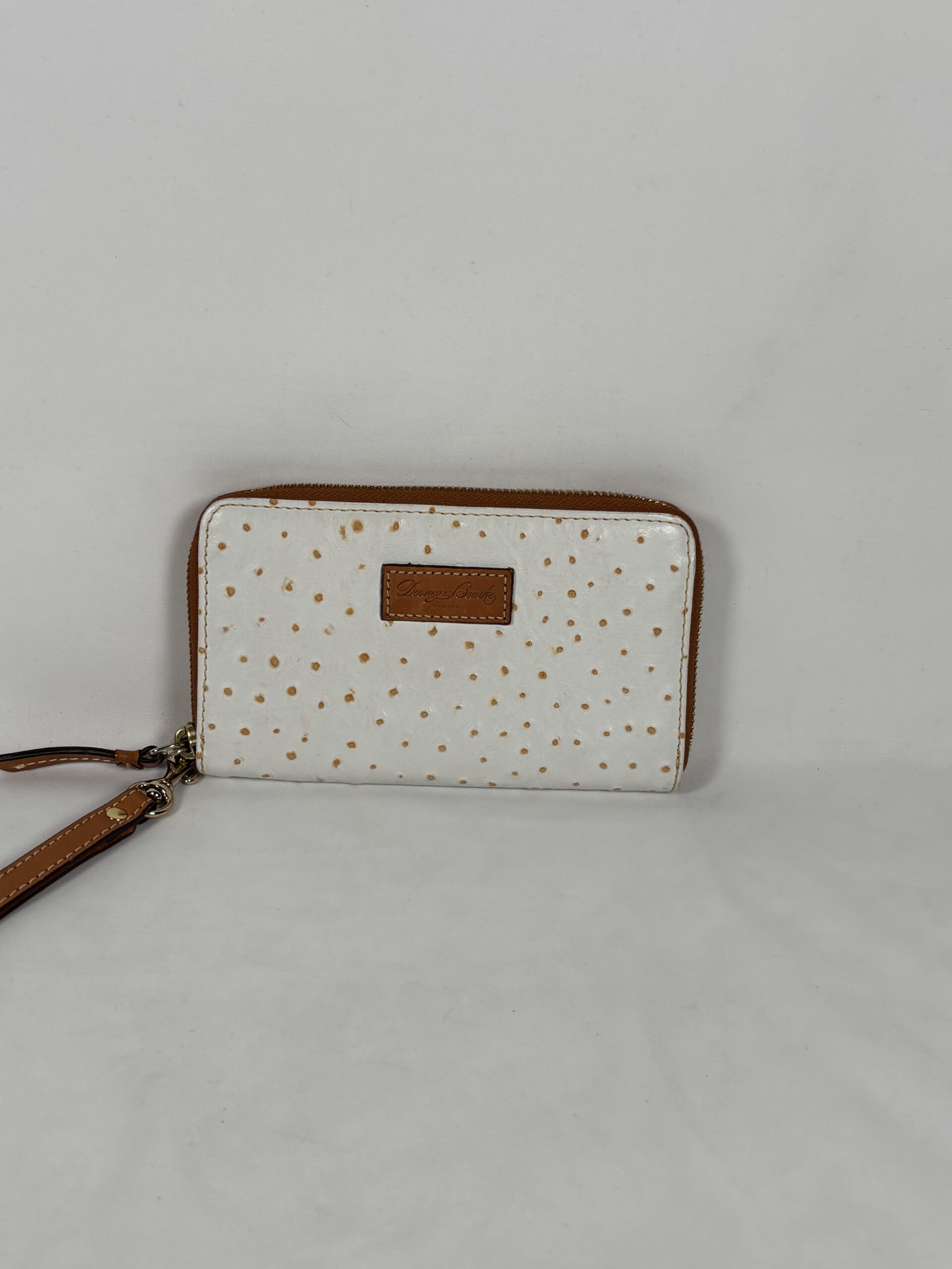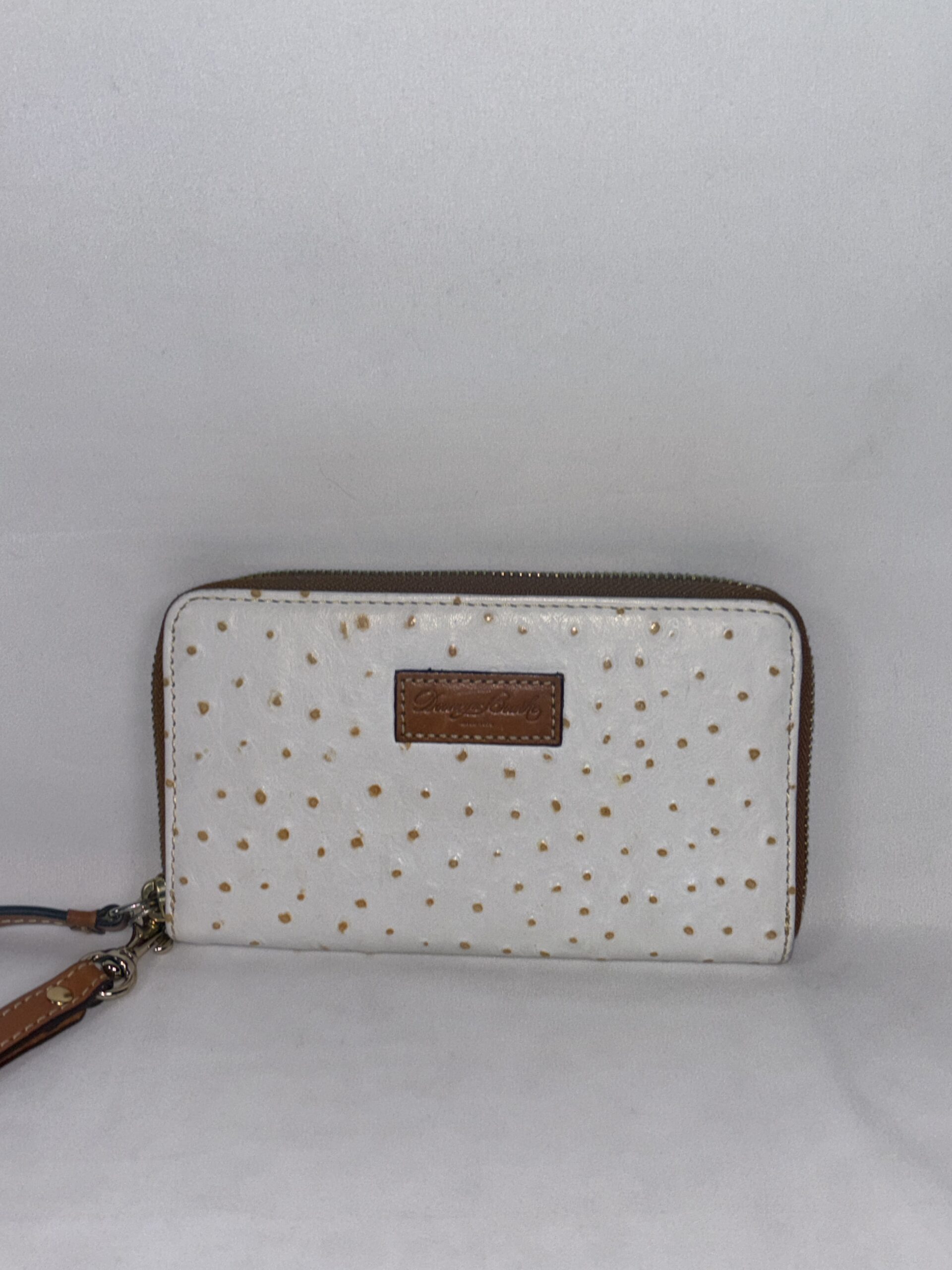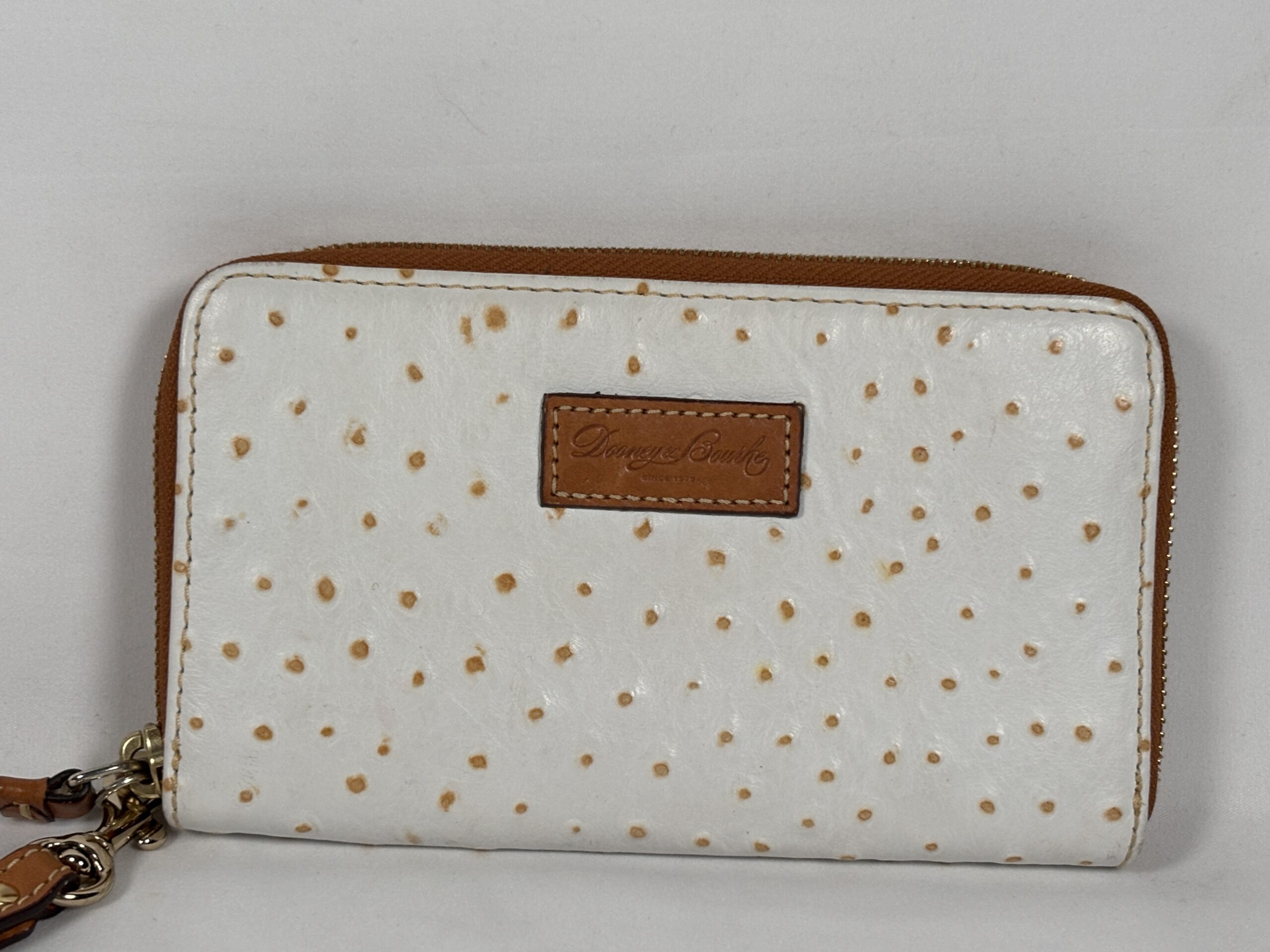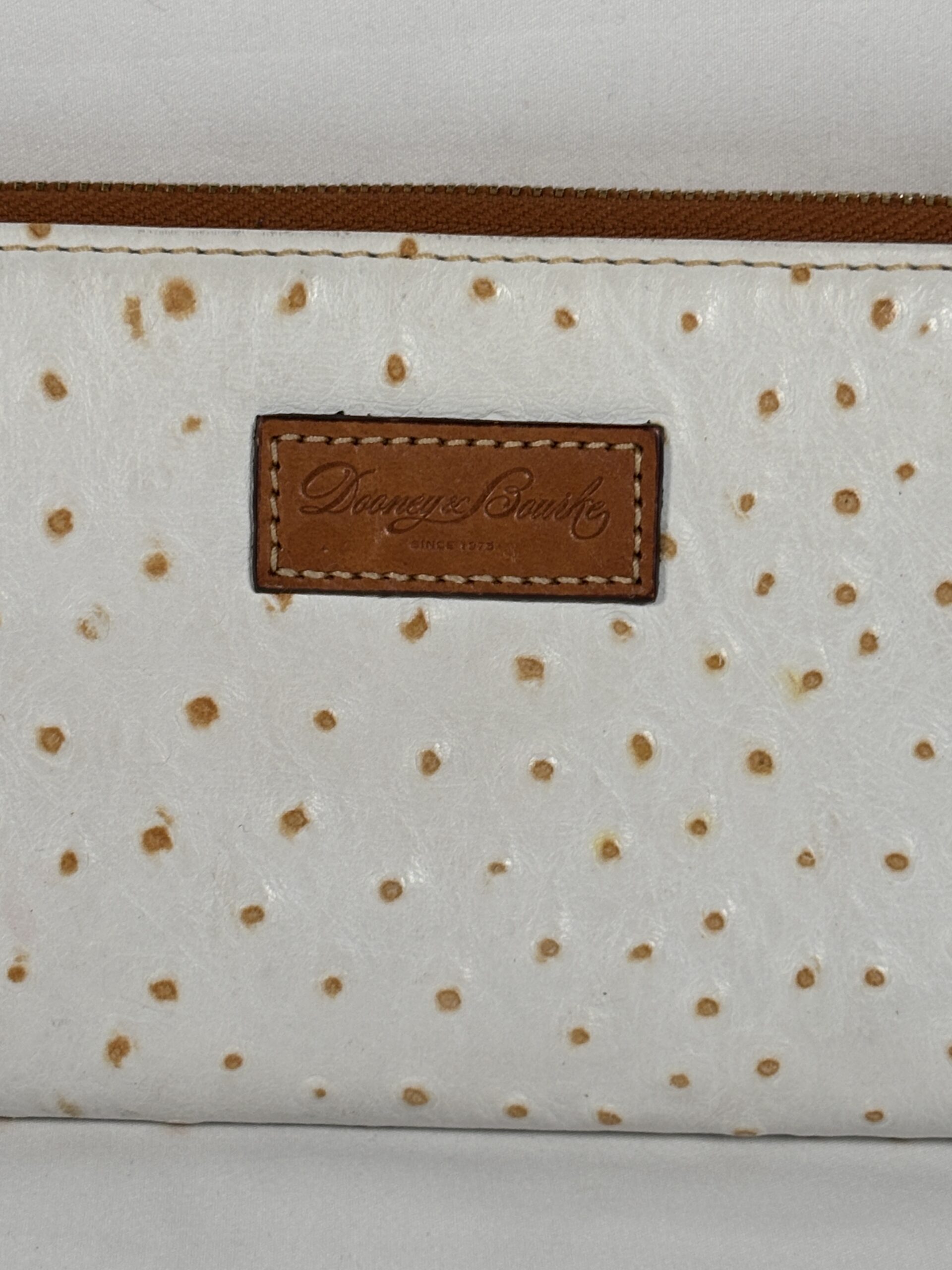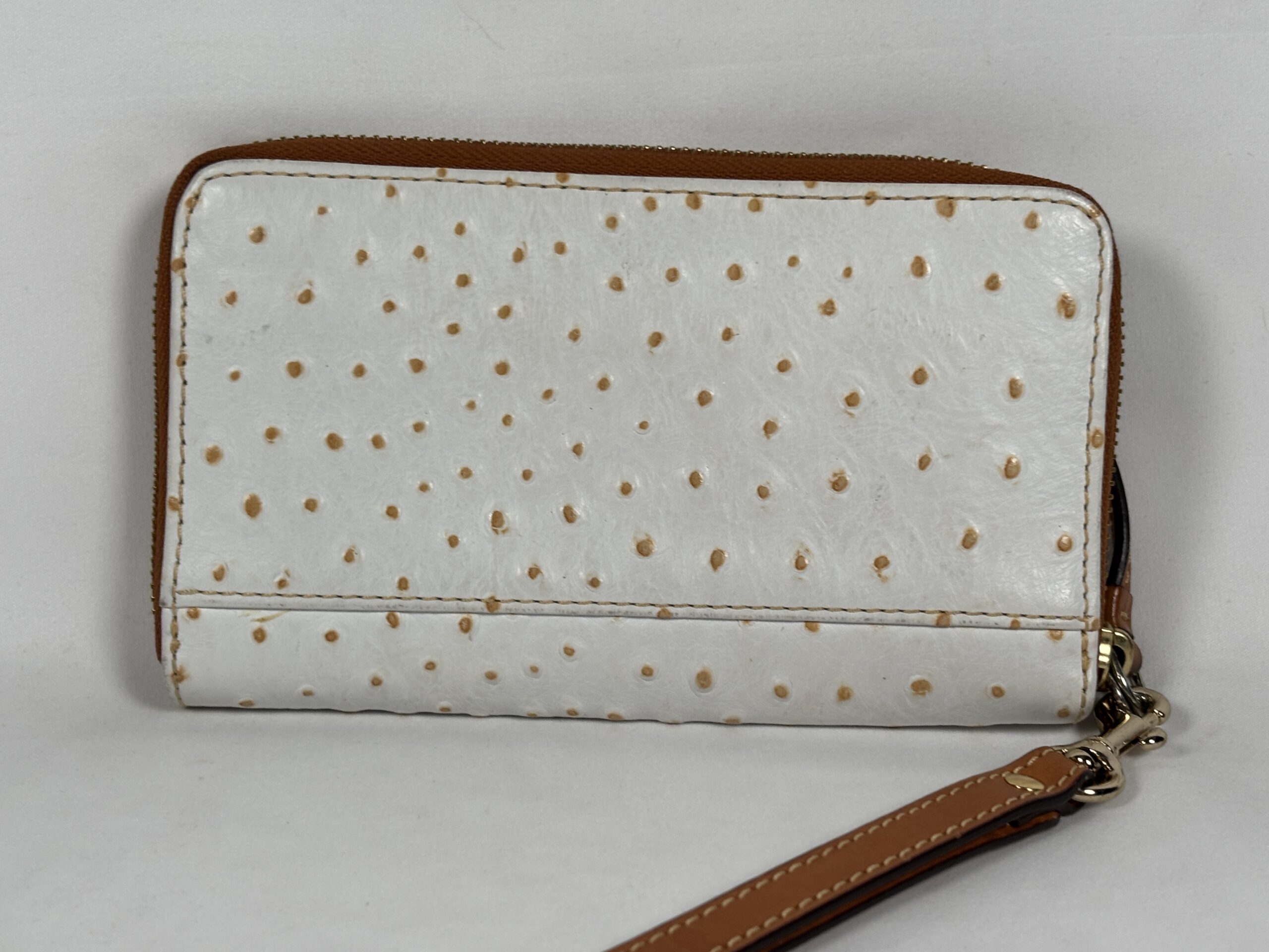 White with light brown accents, over the top zipper, multiple interior card slots