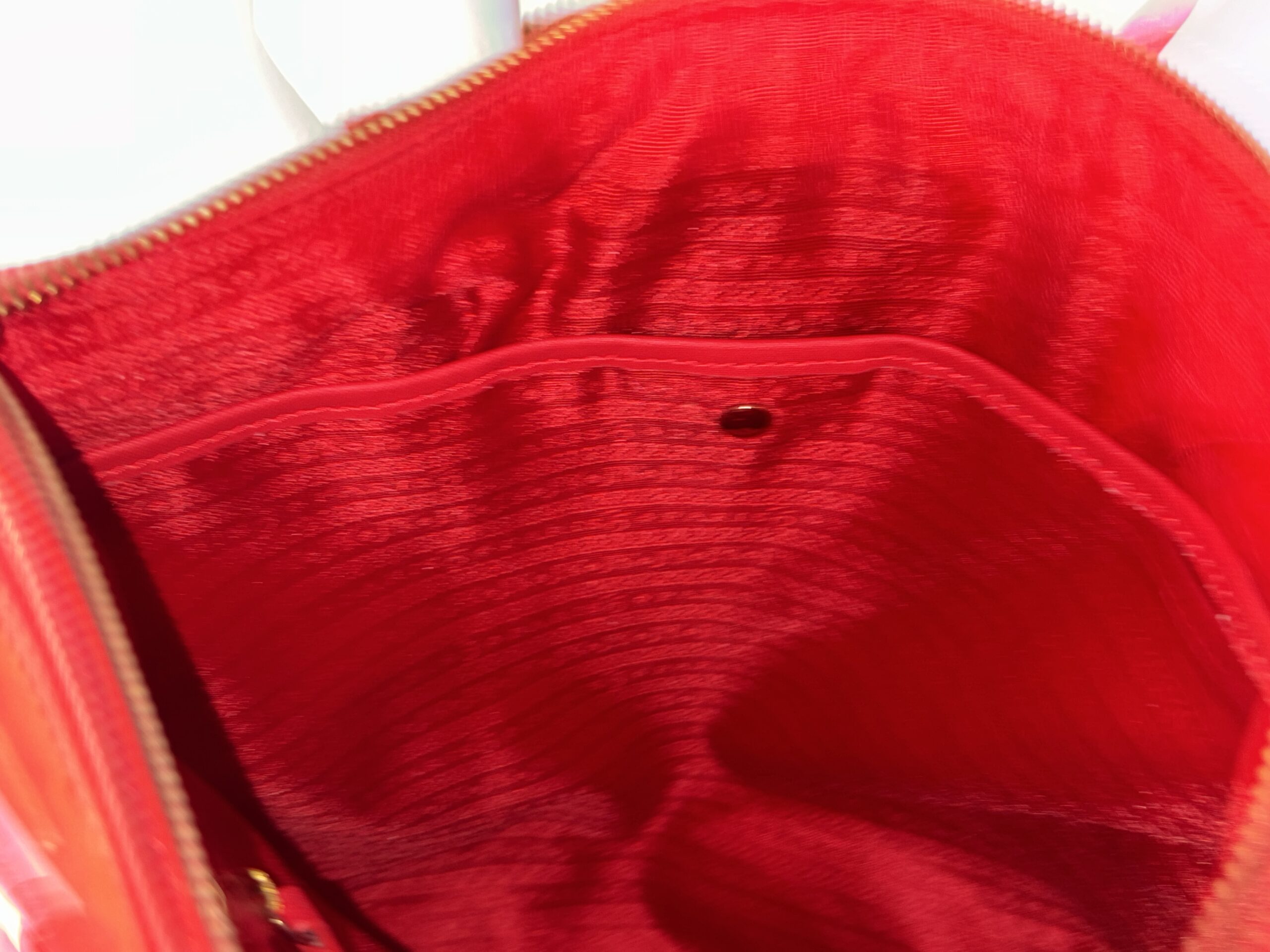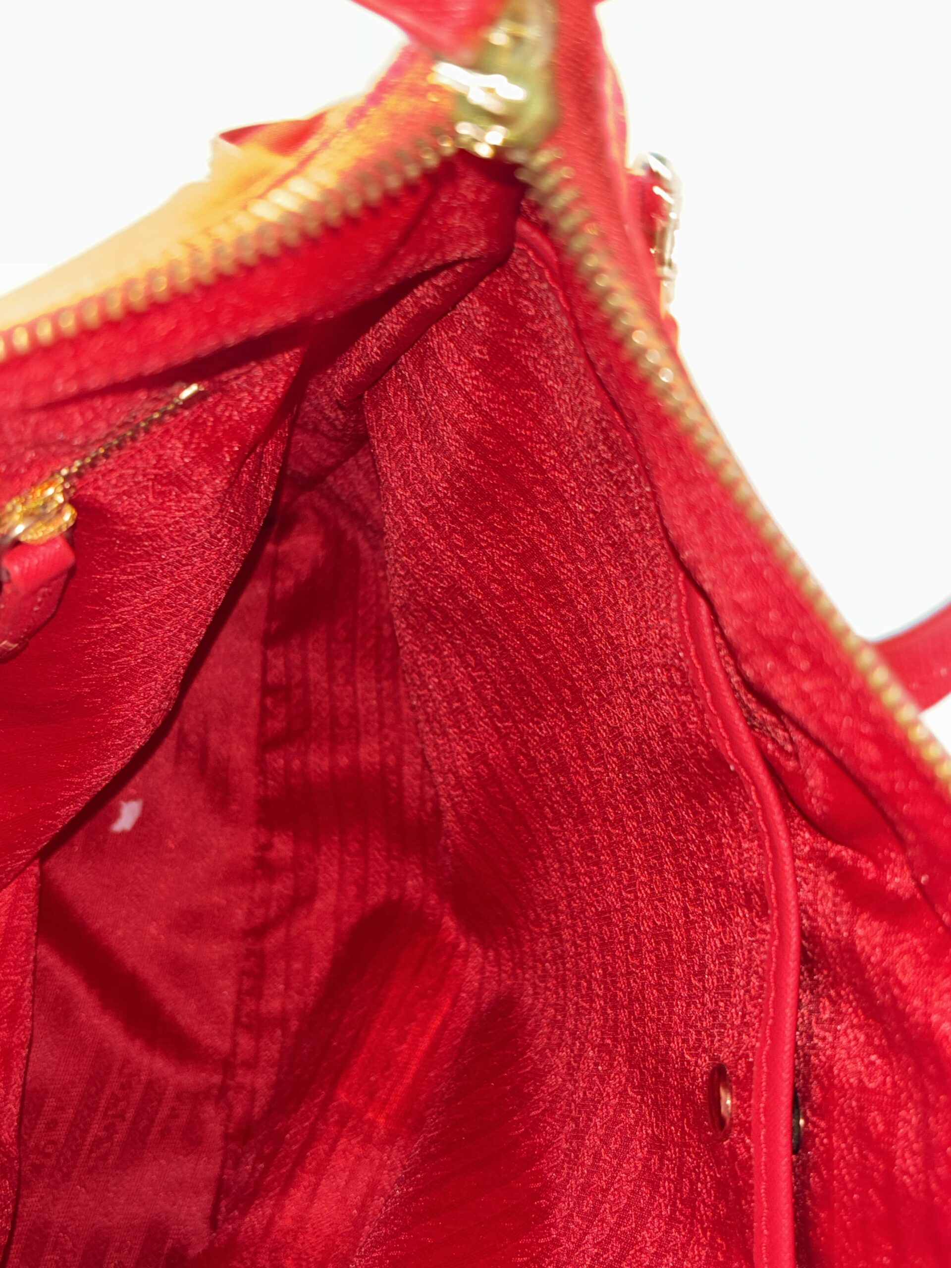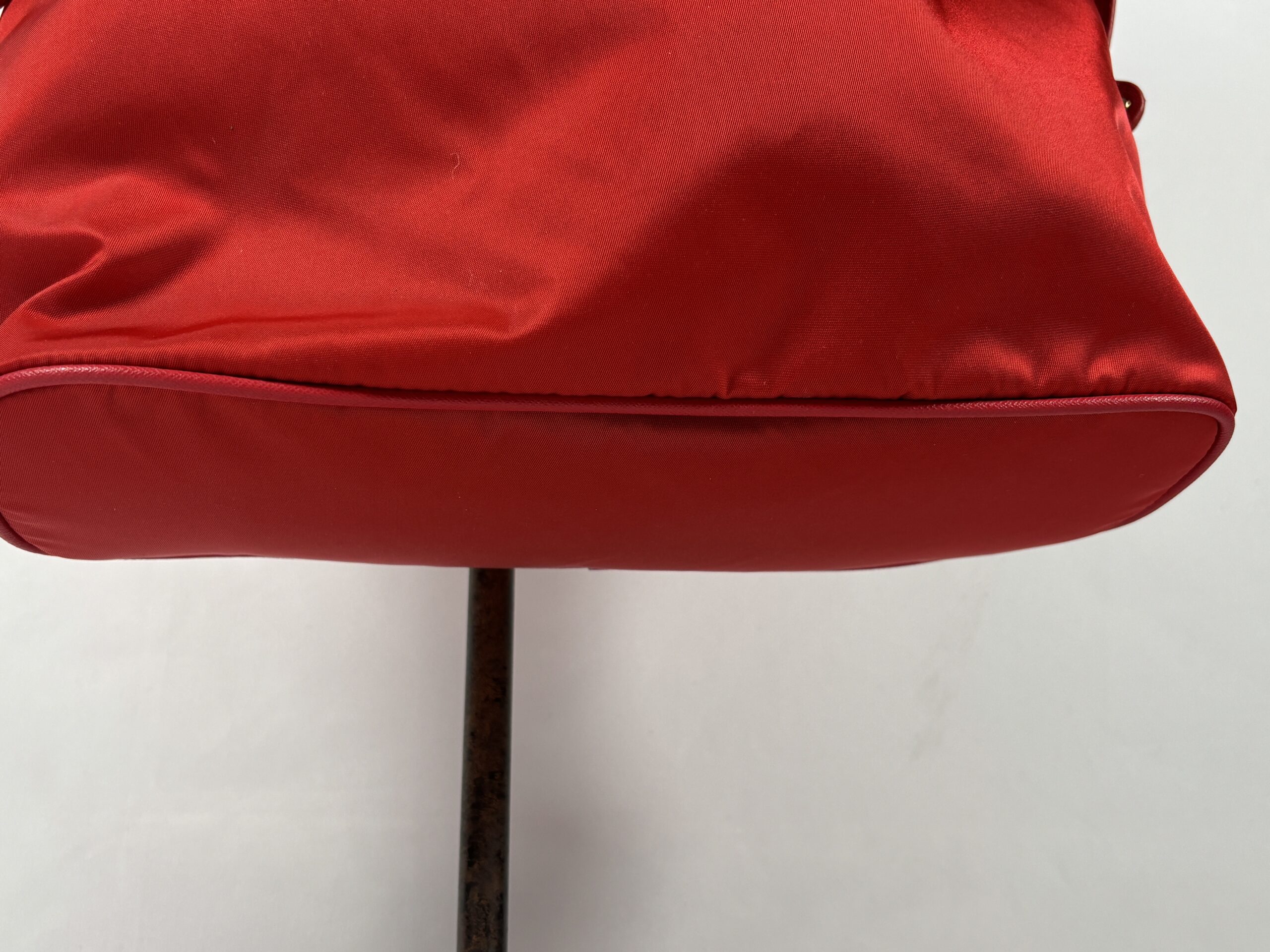 Nylon exterior with leather details and handles. The bag has one zipper pocket and two pockets inside. It is new with tags.