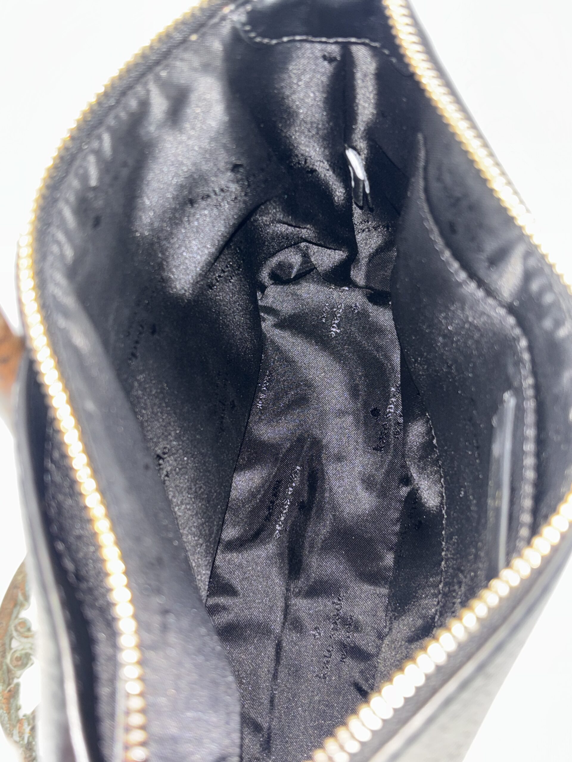 Fully leather exterior. Cloth interior, clean. The bag has one pocket on the outside front. One pocket inside.