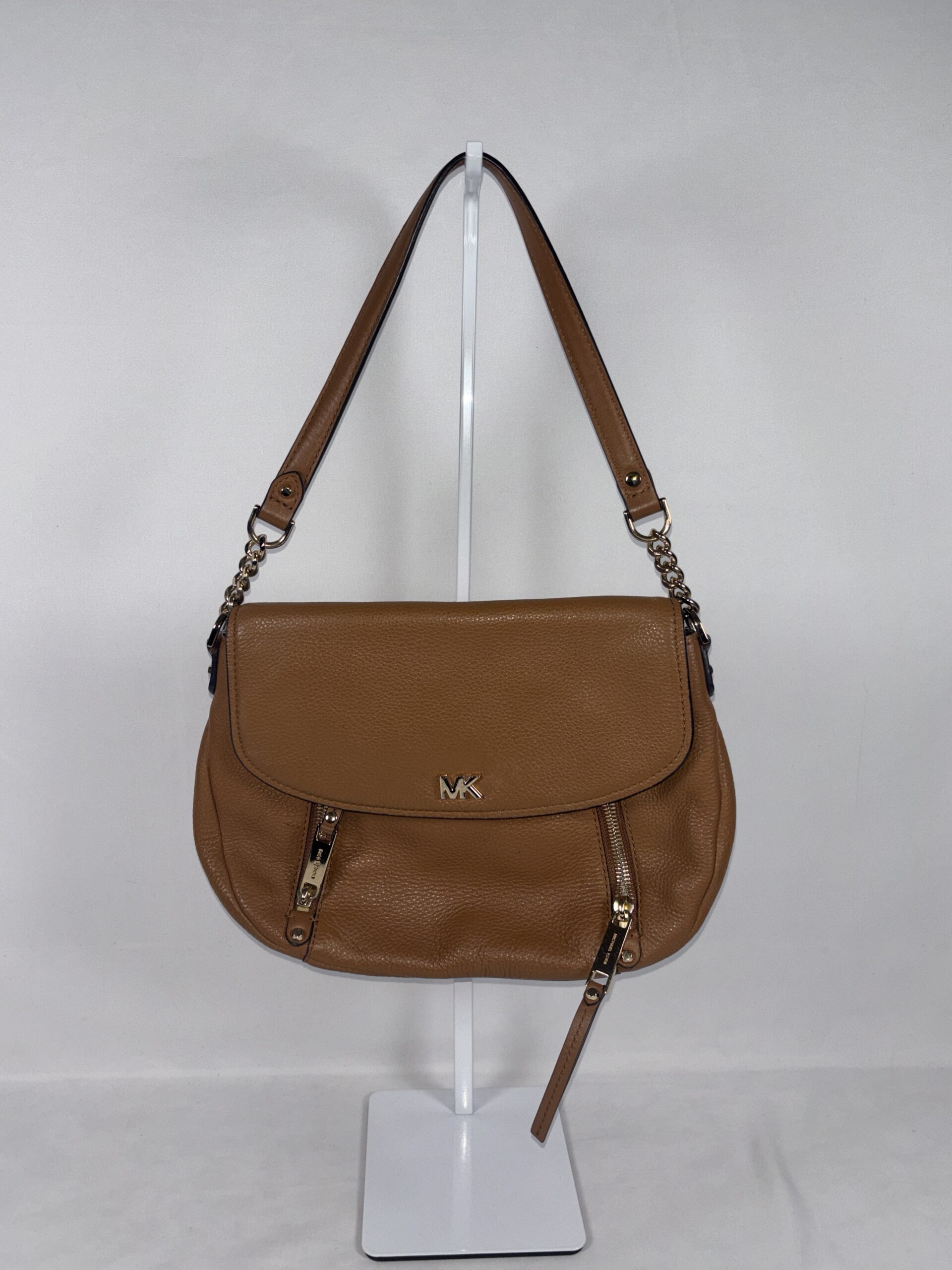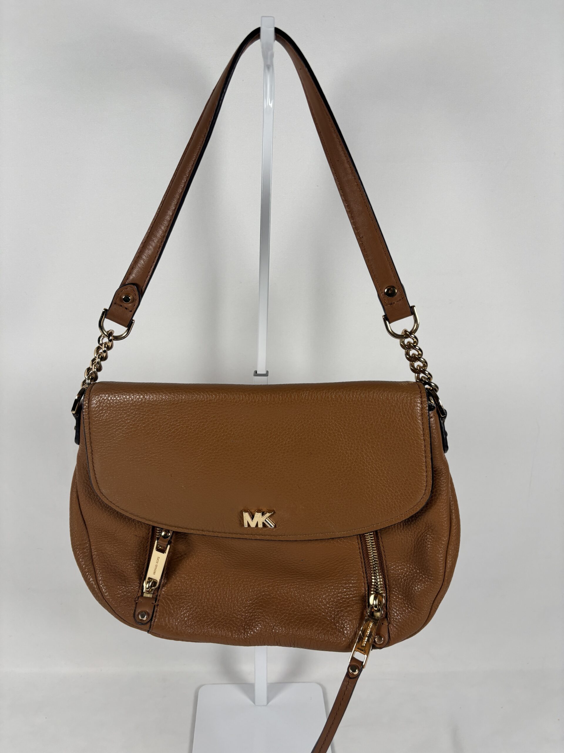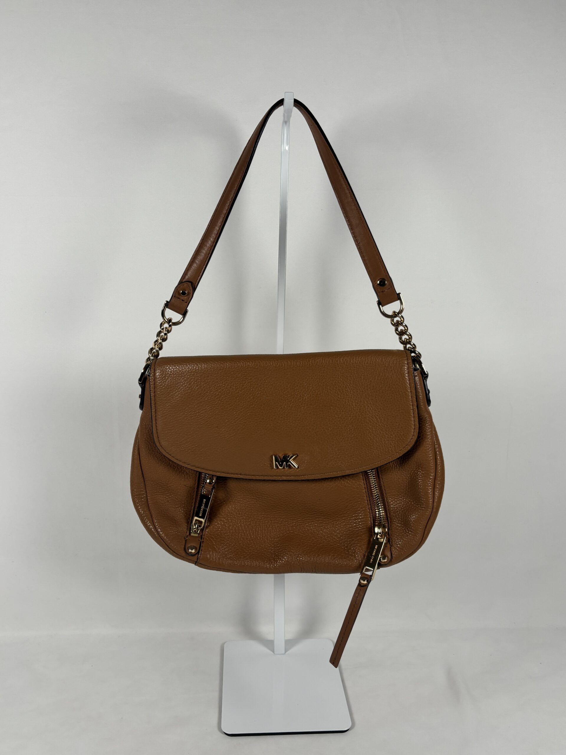 MK pebble leather shoulder bag, ‘luggage brown’ color, multiple exterior zipper pockets, gold accents, interior zipper and open pockets.