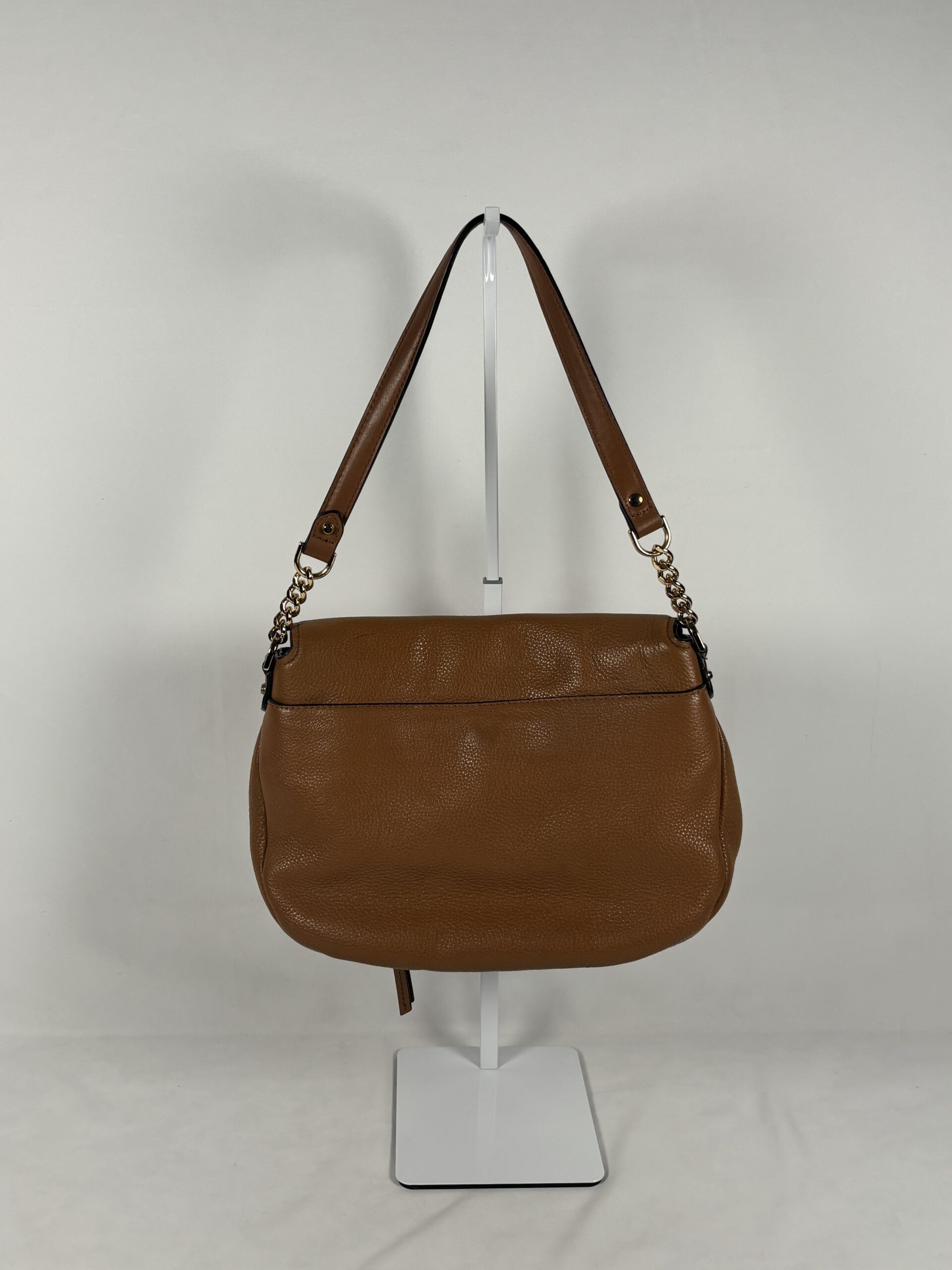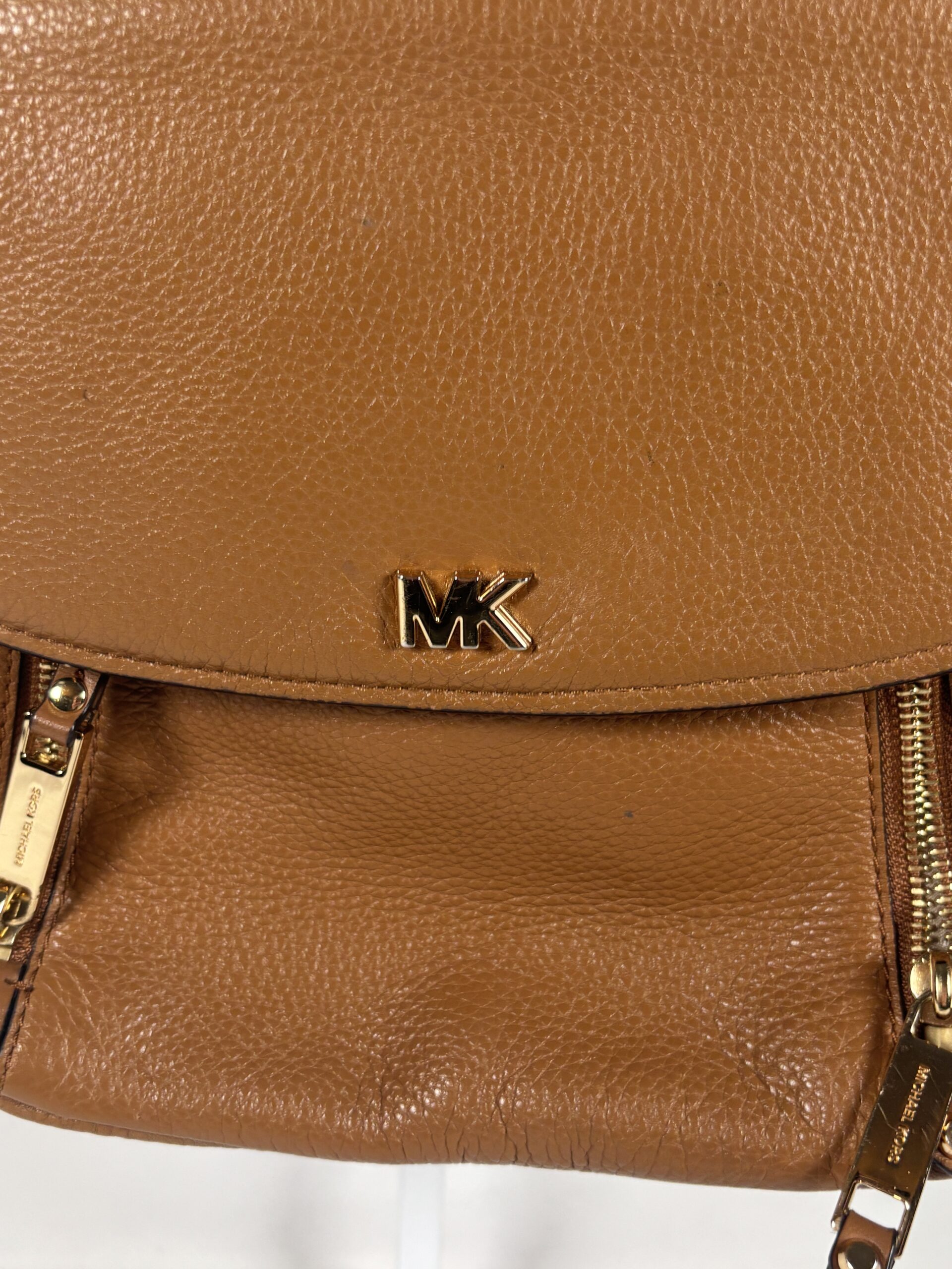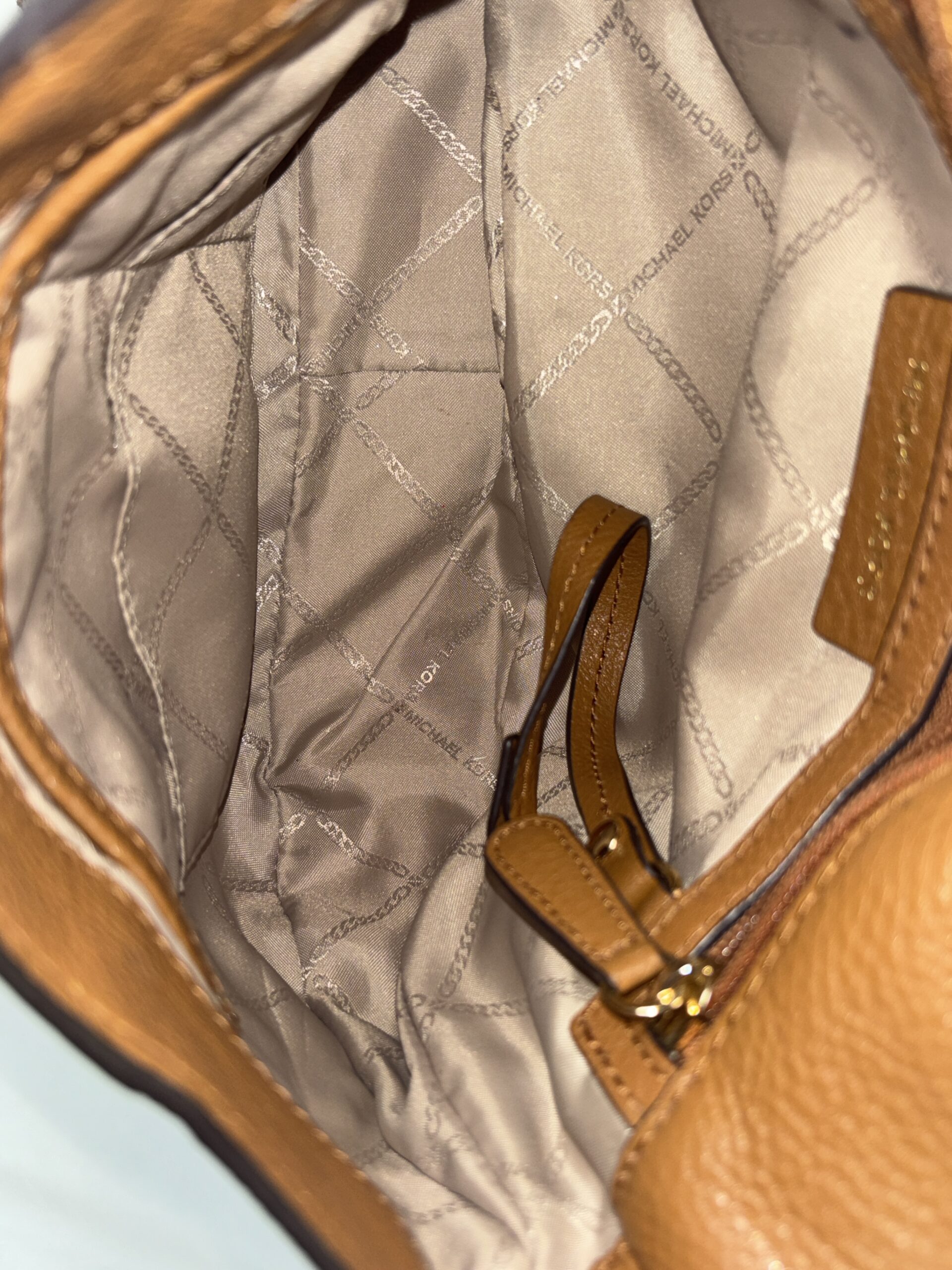 MK pebble leather shoulder bag, ‘luggage brown’ color, multiple exterior zipper pockets, gold accents, interior zipper and open pockets.