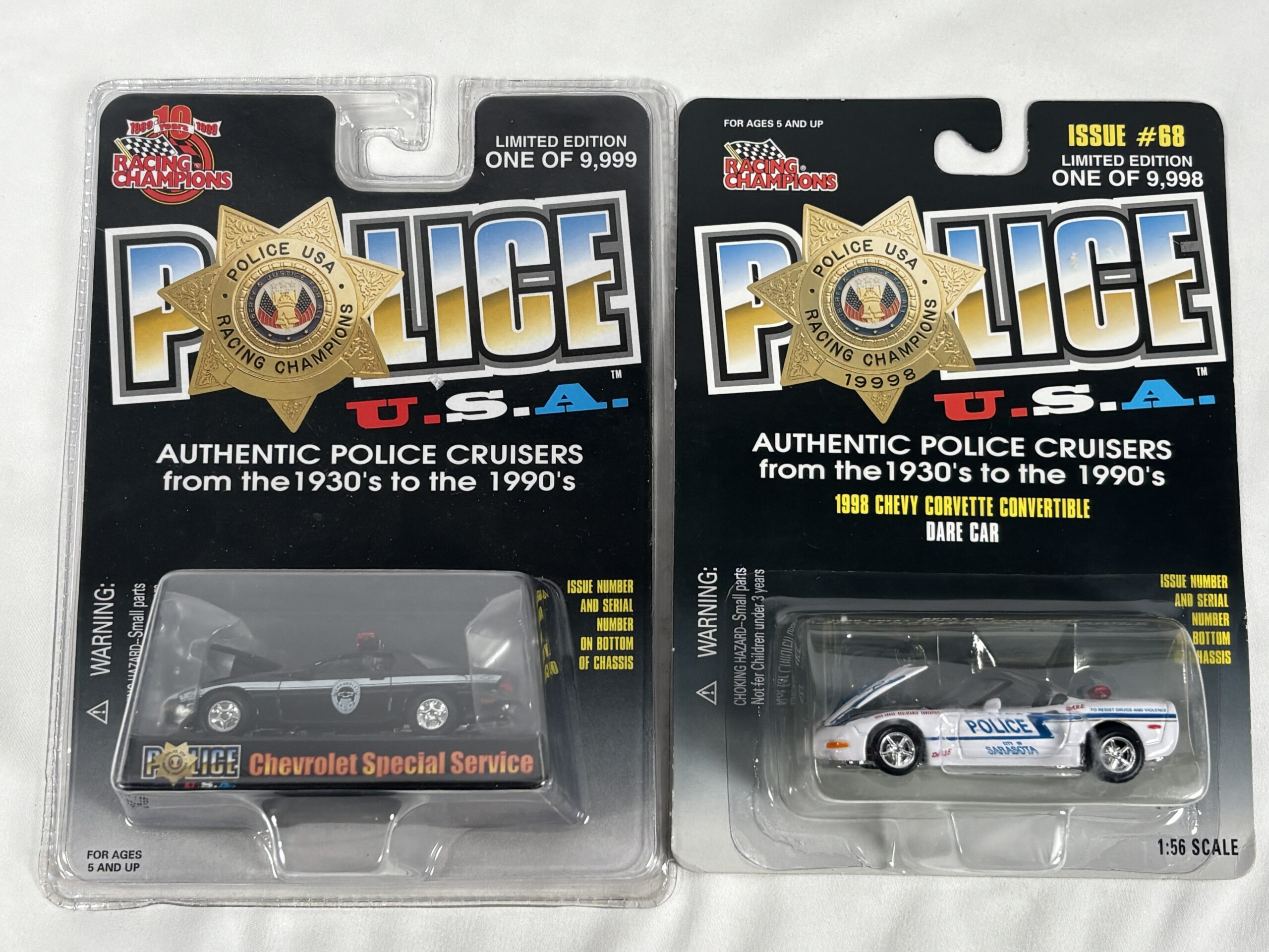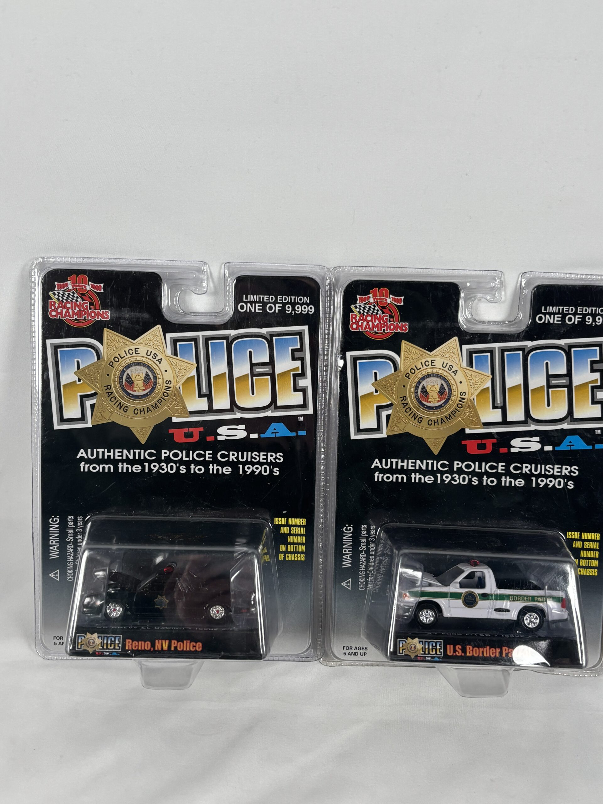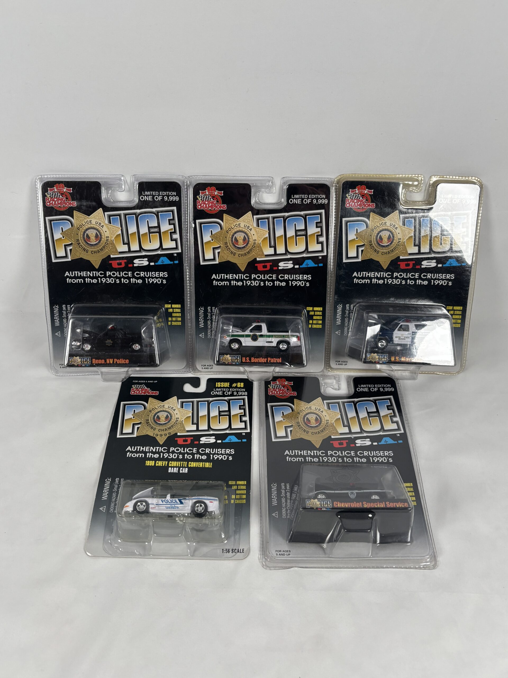 Collection of toy police cars, vary from 1930s-1990s, unopened hard plastic packaging, limited edition