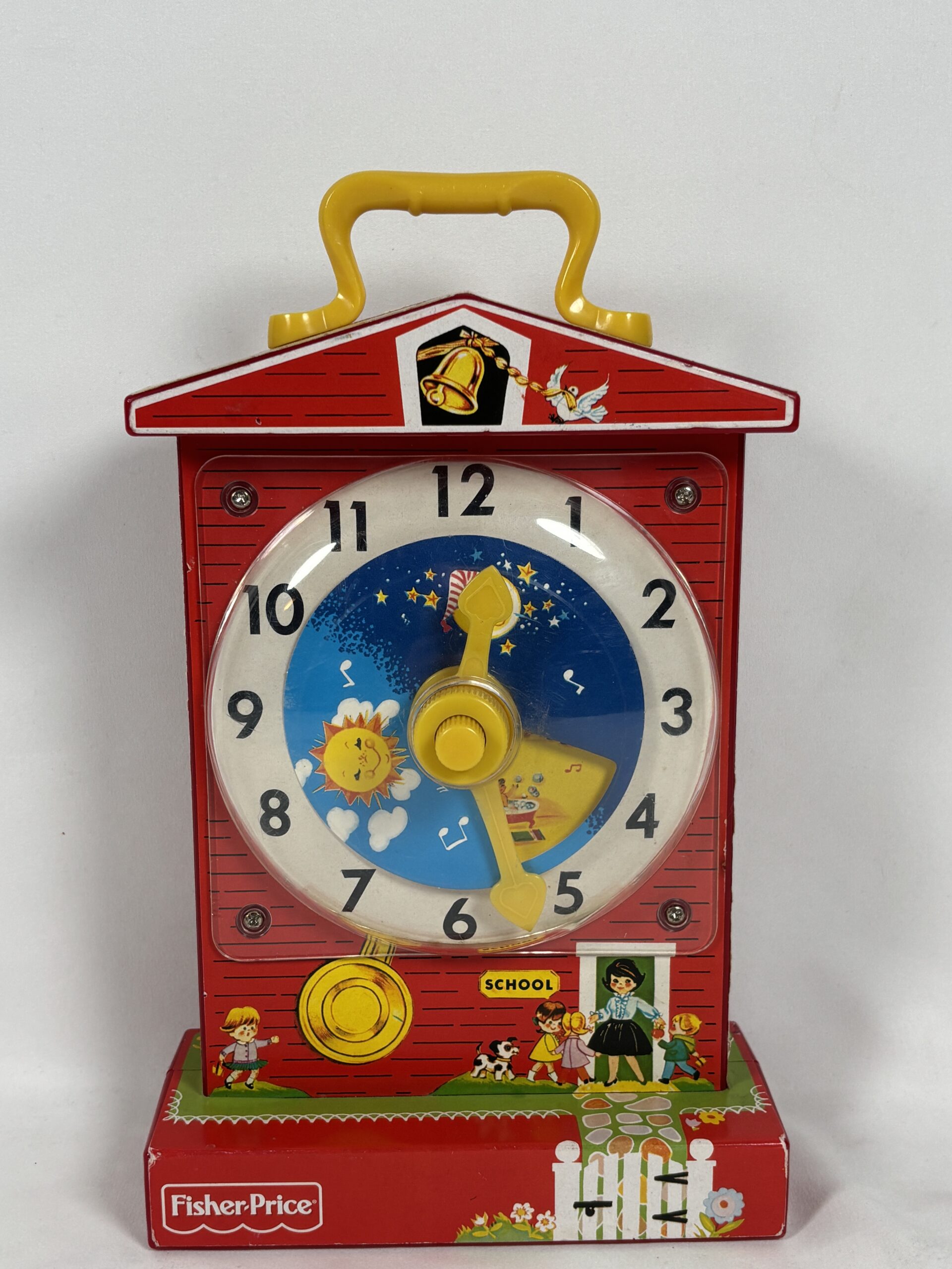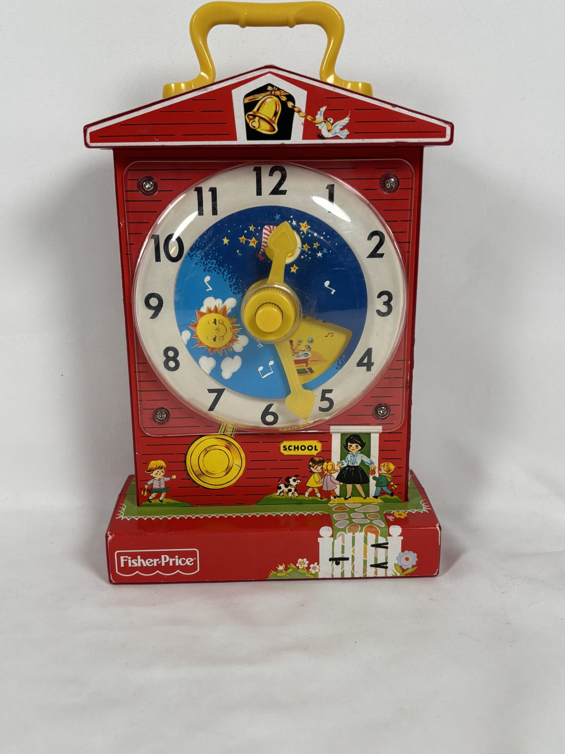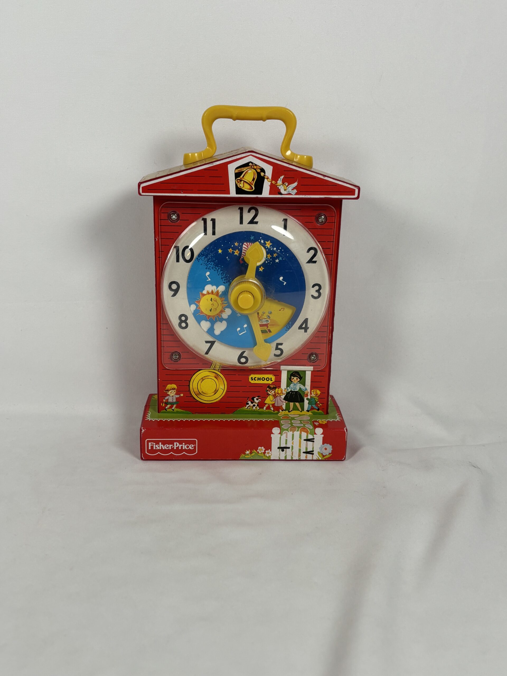 Red fisher price toy clock, functioning with sound, included with a carrying handle