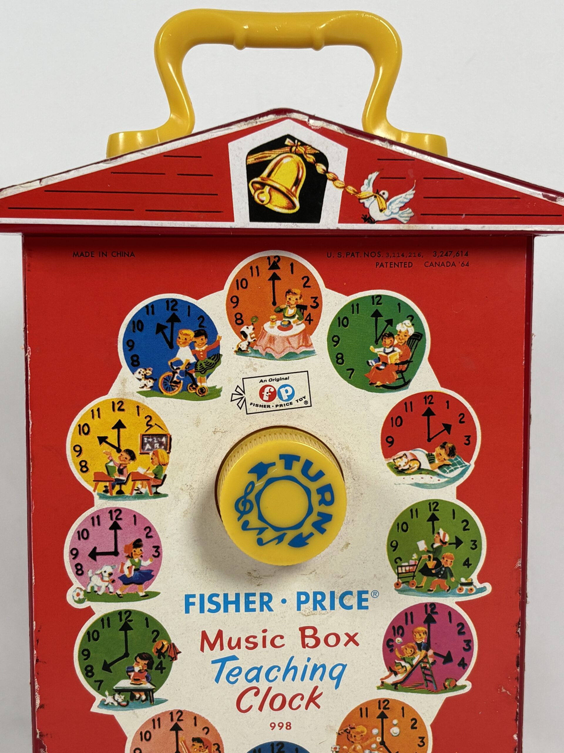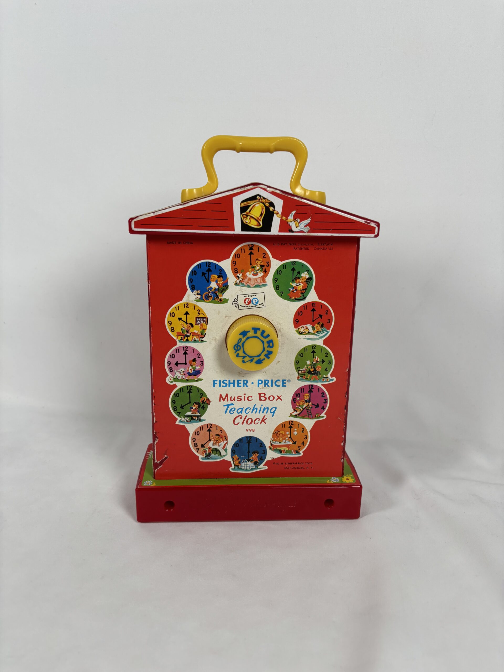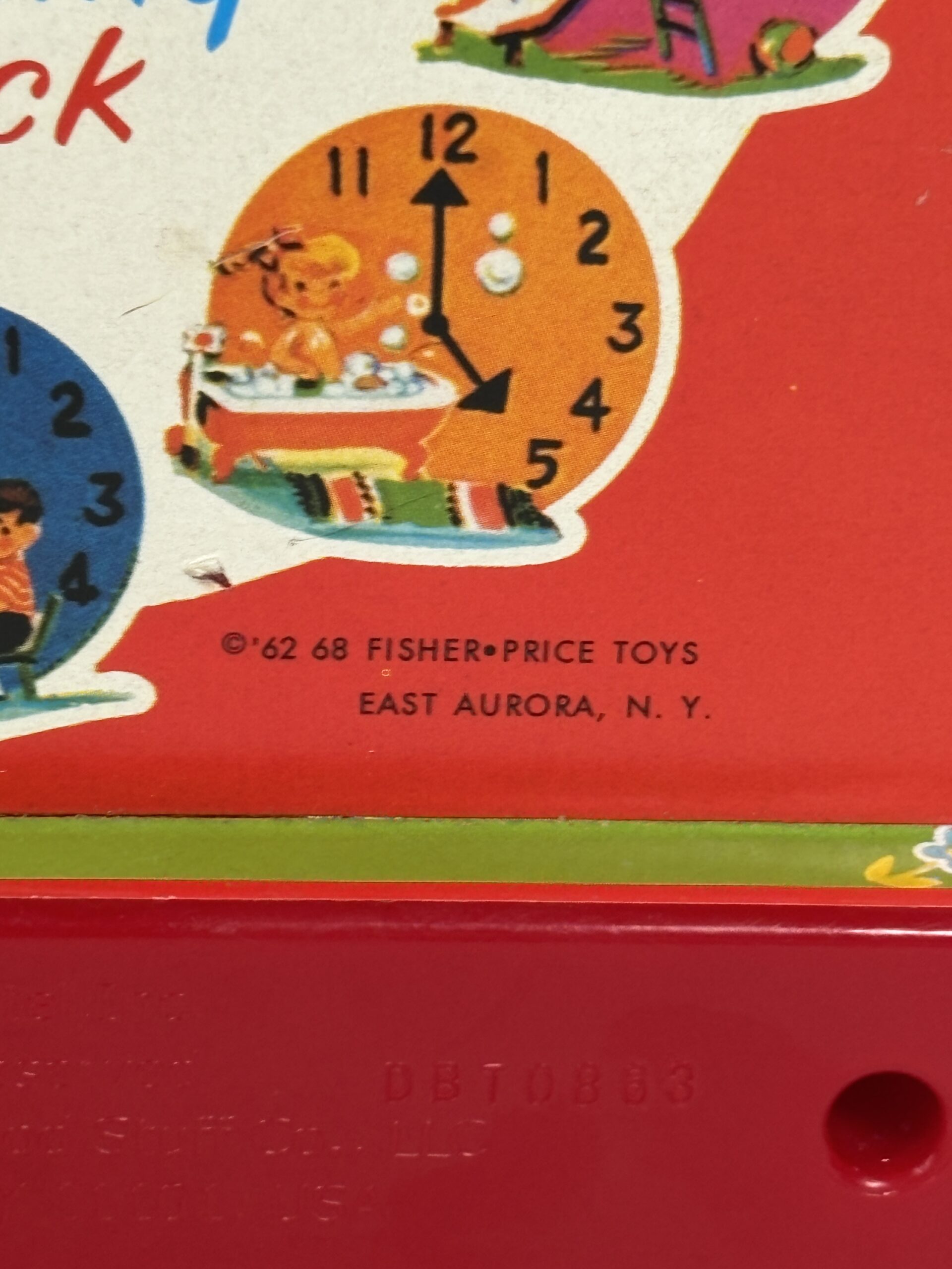 Red fisher price toy clock, functioning with sound, included with a carrying handle
