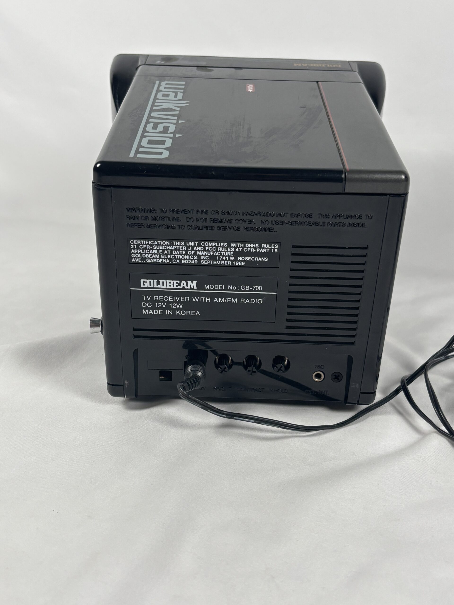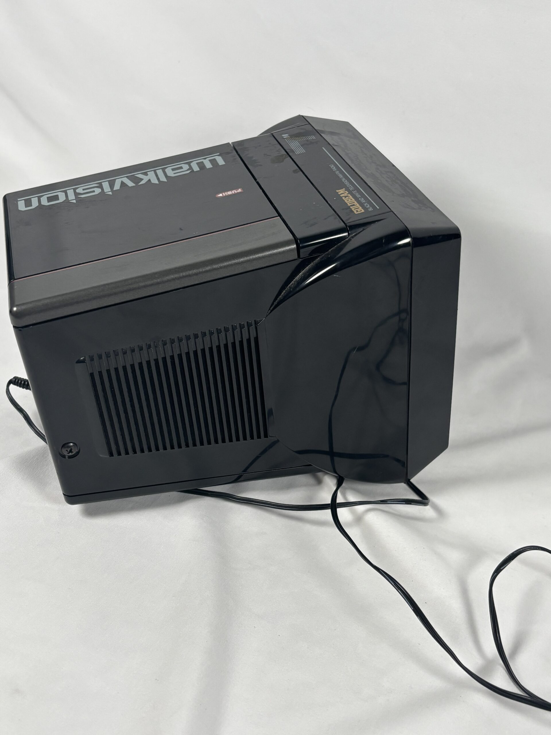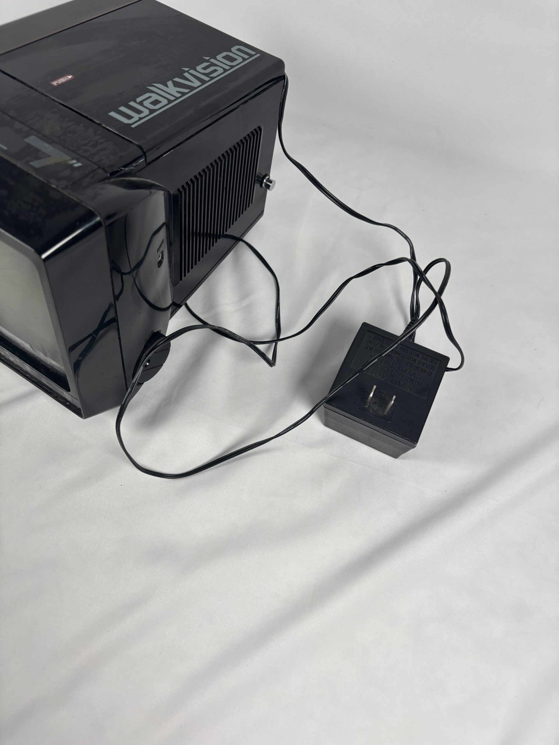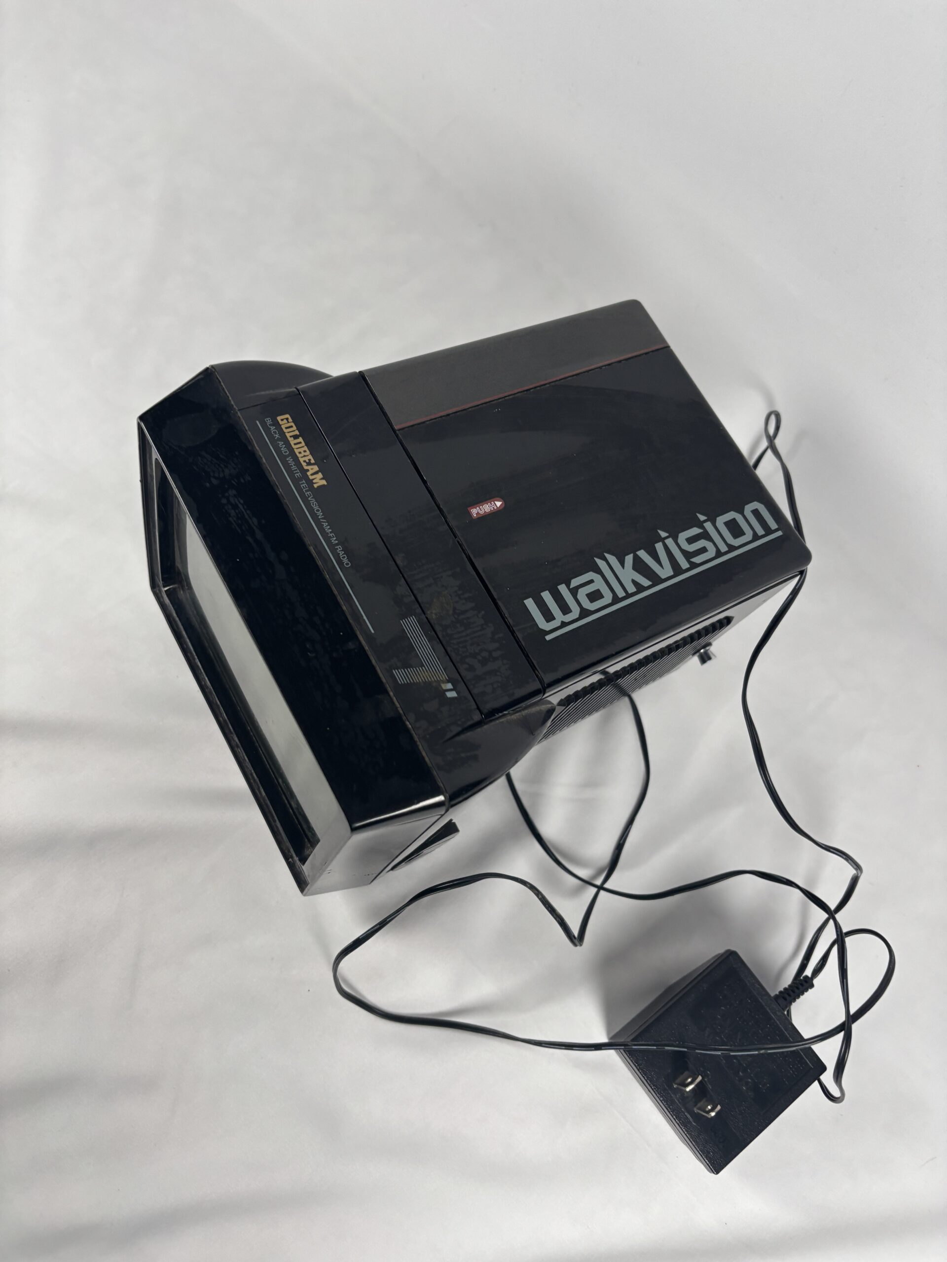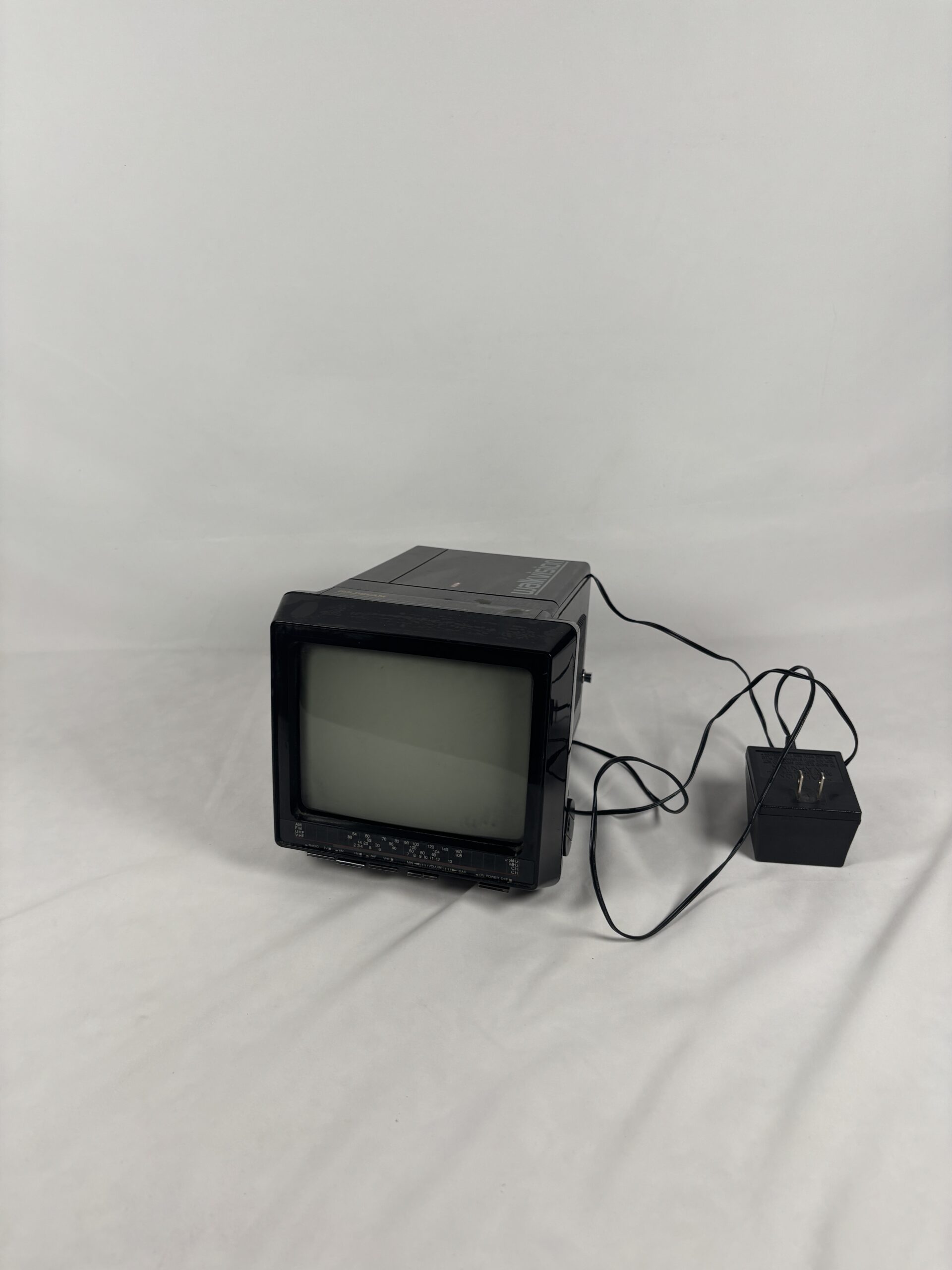 Full diagonal black and white picture tube, built in fm radio receiver, portable, designed for indoor and outdoor use.